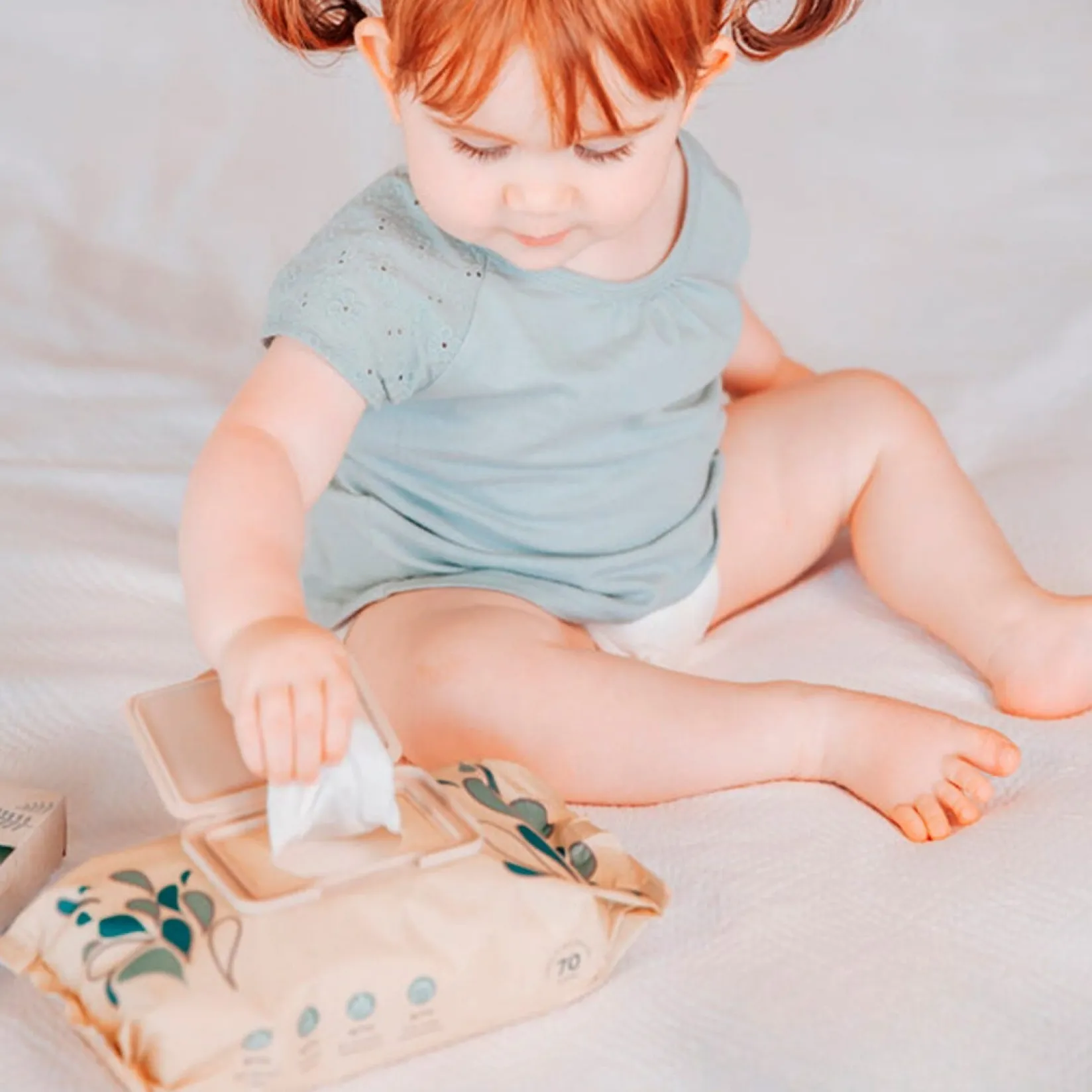 -100% home compostable baby wipes. 0% Plastic, Chemicals, Fragrance, Optical Brighteners or other Harsh Ingredients.