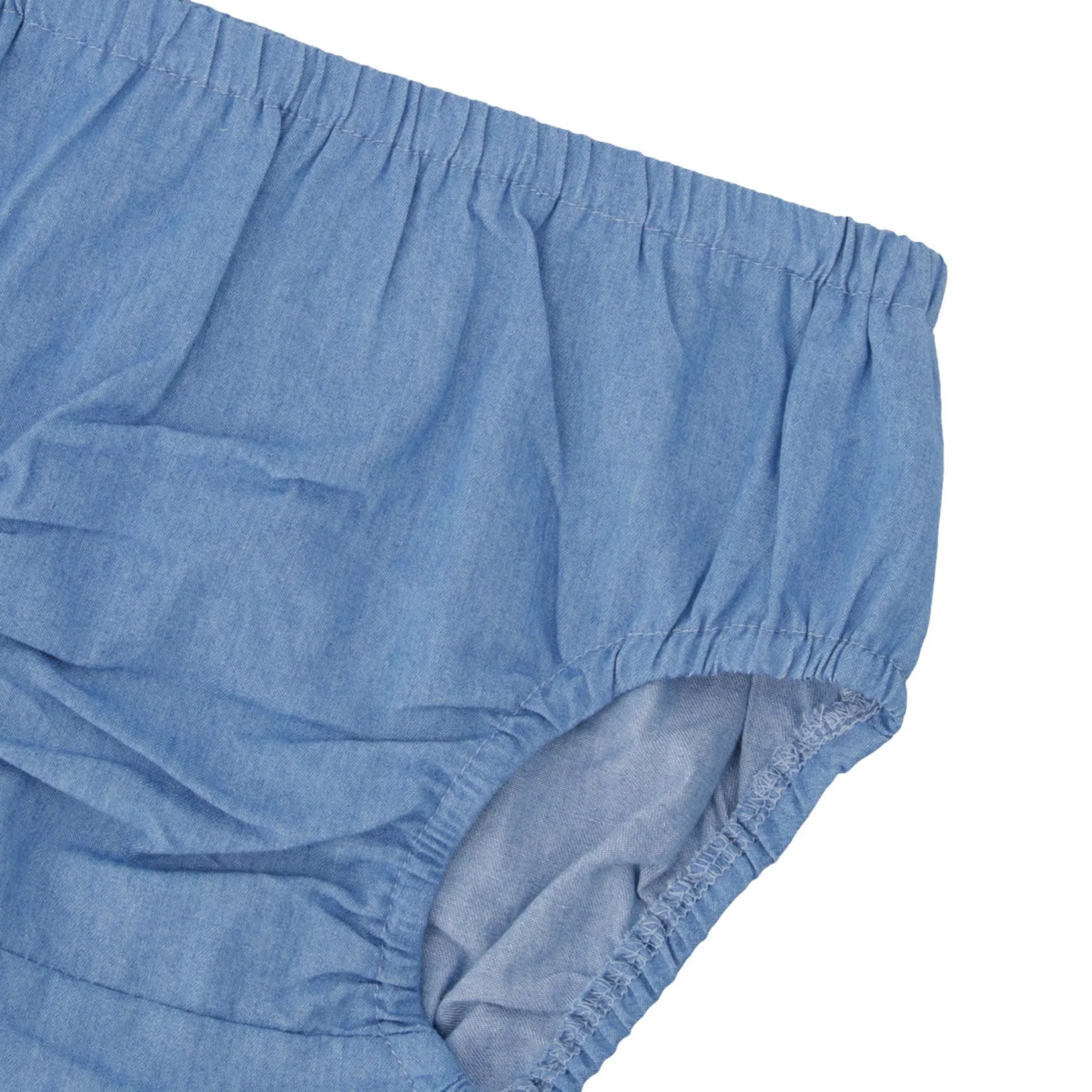 The chambray dress and bloomer set in light blue is a fresh and elegant choice for baby girls. The sleeveless dress features frilled shoulders, gathered details, and playful patch pockets adorned with delicate floral embroidery. The matching chambray bloomer completes the outfit with comfort and practicality, allowing little ones to move freely while looking stylish. Made from a soft lyocell blend chambray with added stretch, the fabric offers lightness, durability, and a gentle drape. A sweet outfit from our “Blueberry Cuddles” collection, perfect for sunny days and family outings.