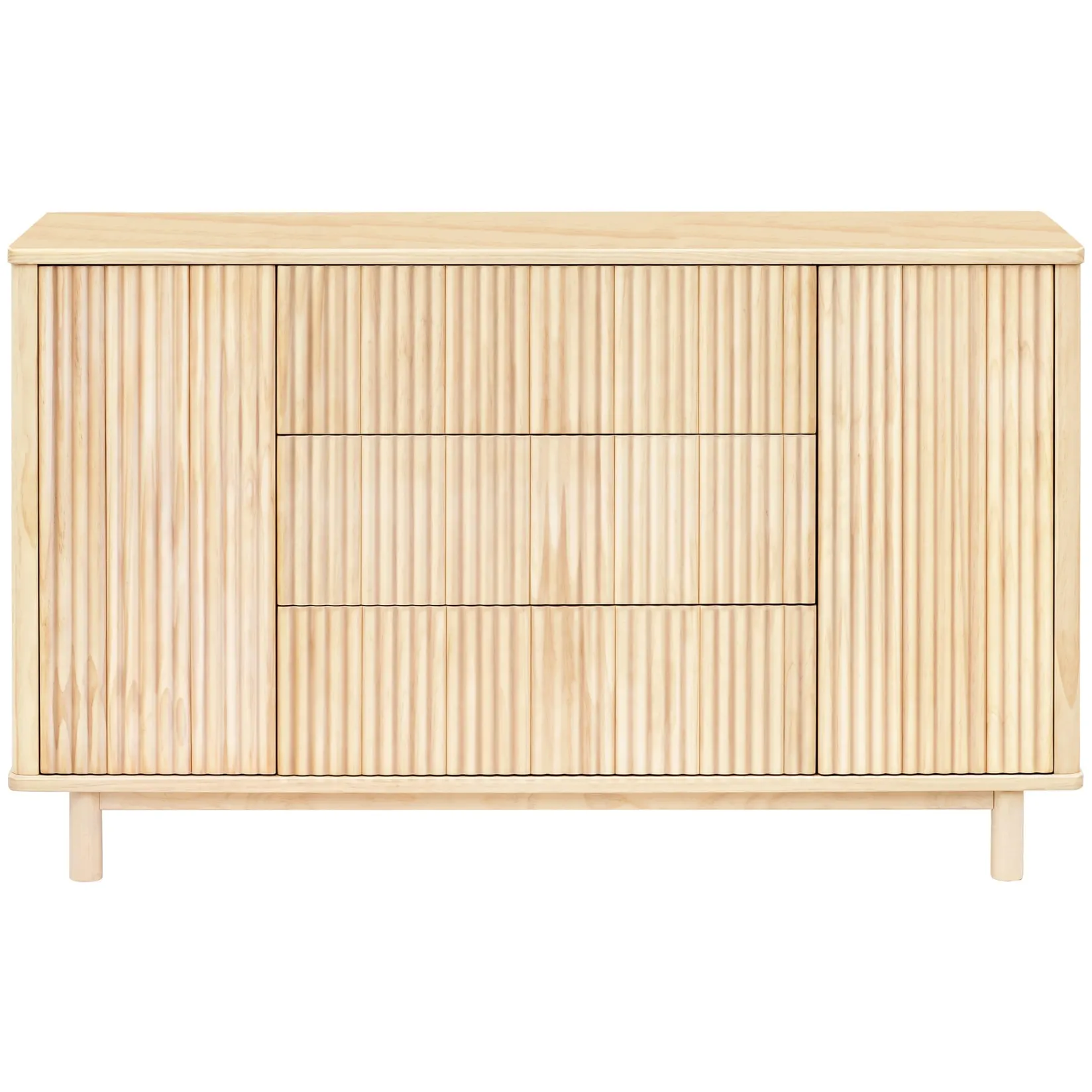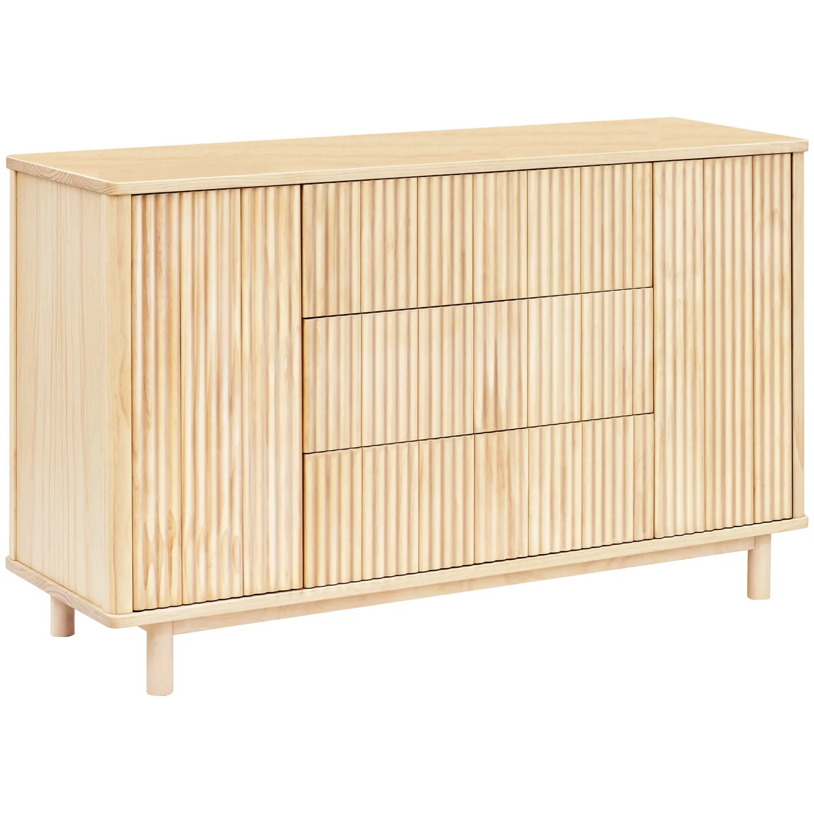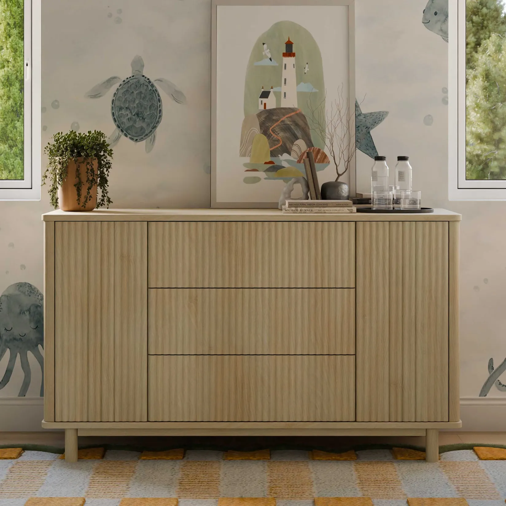 The timeless Pogo Tambour Assembled Dresser exudes modern elegance with its textured fluted tambour paneling, smooth, rounded edges, and elevated silhouette. Designed for the nursery but beautiful enough for use throughout the home, it features push to open smooth-gliding drawers, spacious side cabinets, included anti-tip kit for safety, and best of all, it arrives fully assembled, ready out of the box.