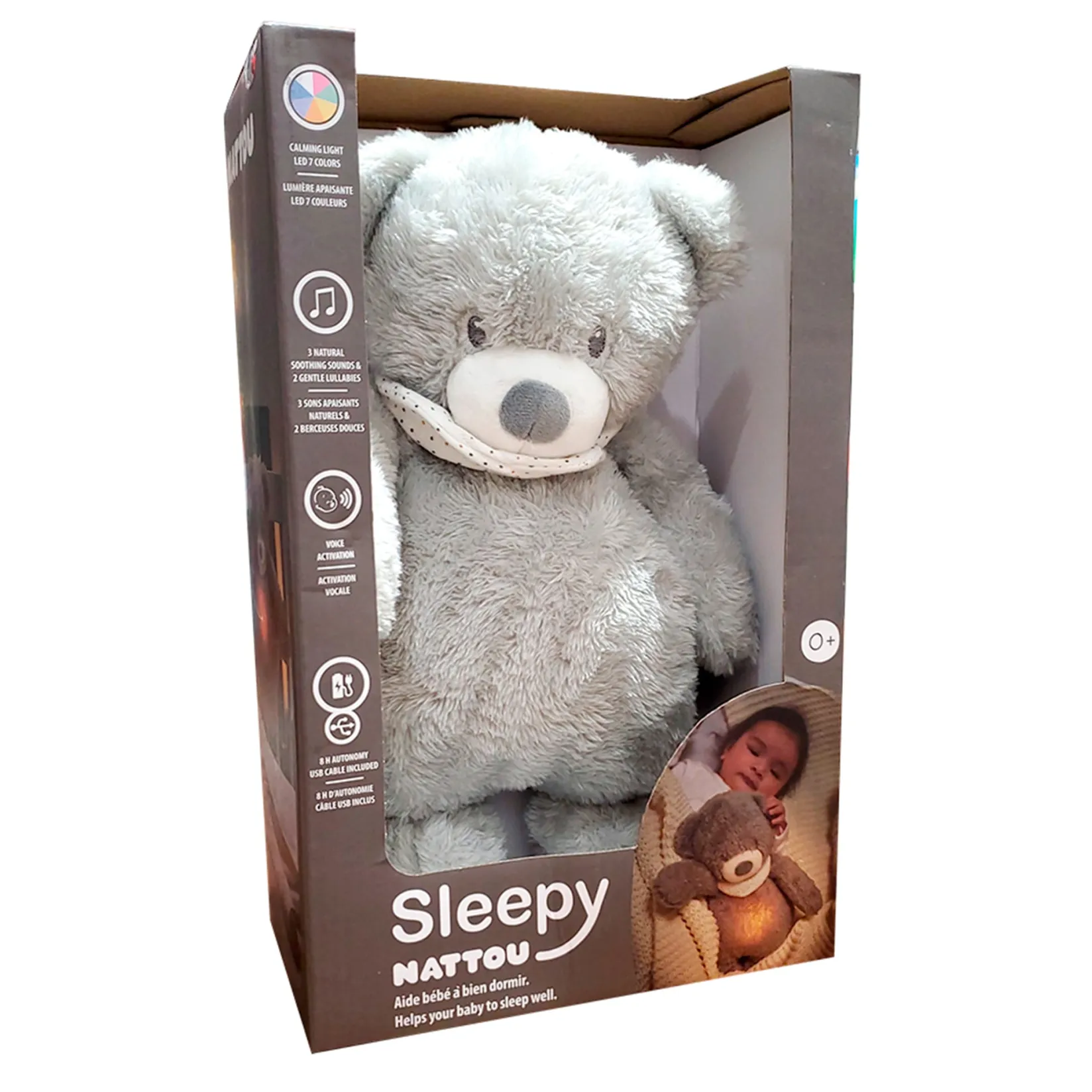 Additionally, the plush toy features a detection mode that plays soft melodies for 15 minutes when the child begins to cry. It is rechargeable with a USB cable and has up to 12 hours of battery life.