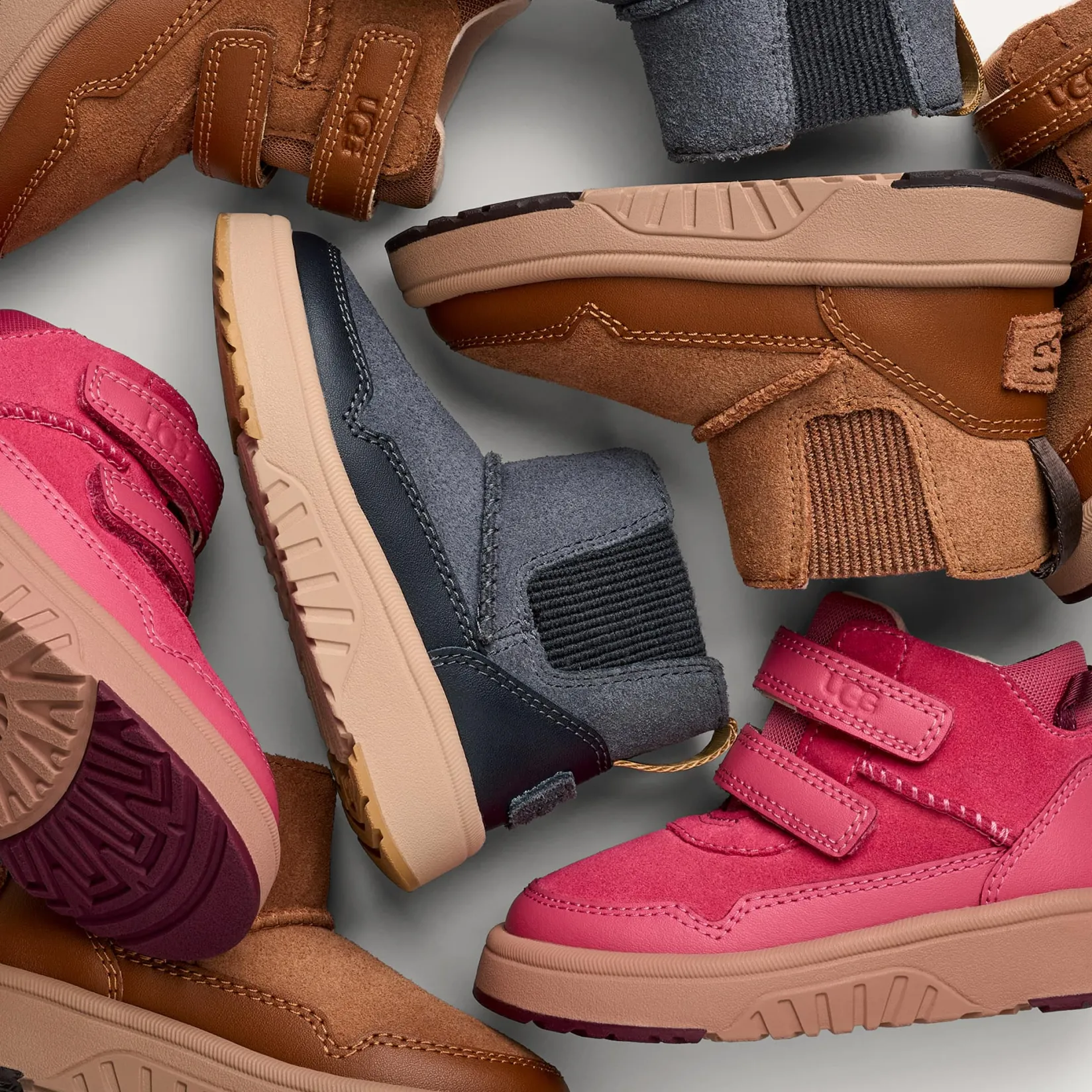 Our Rennie is an easy-wearing sneaker make to keep up with your little one. The upper features a mix of genuine leather and suede detailed with iconic Twin Seams for the look and Feel of UGG®. Two hook-and-loop closures secure the fit while the durable EVA and rubber outsole offers unbelievable flex for kiddos on the go. Lined with a soft textile lining finished with a peppermint-based anti-odor treatment for enhanced freshness, wear after wear.