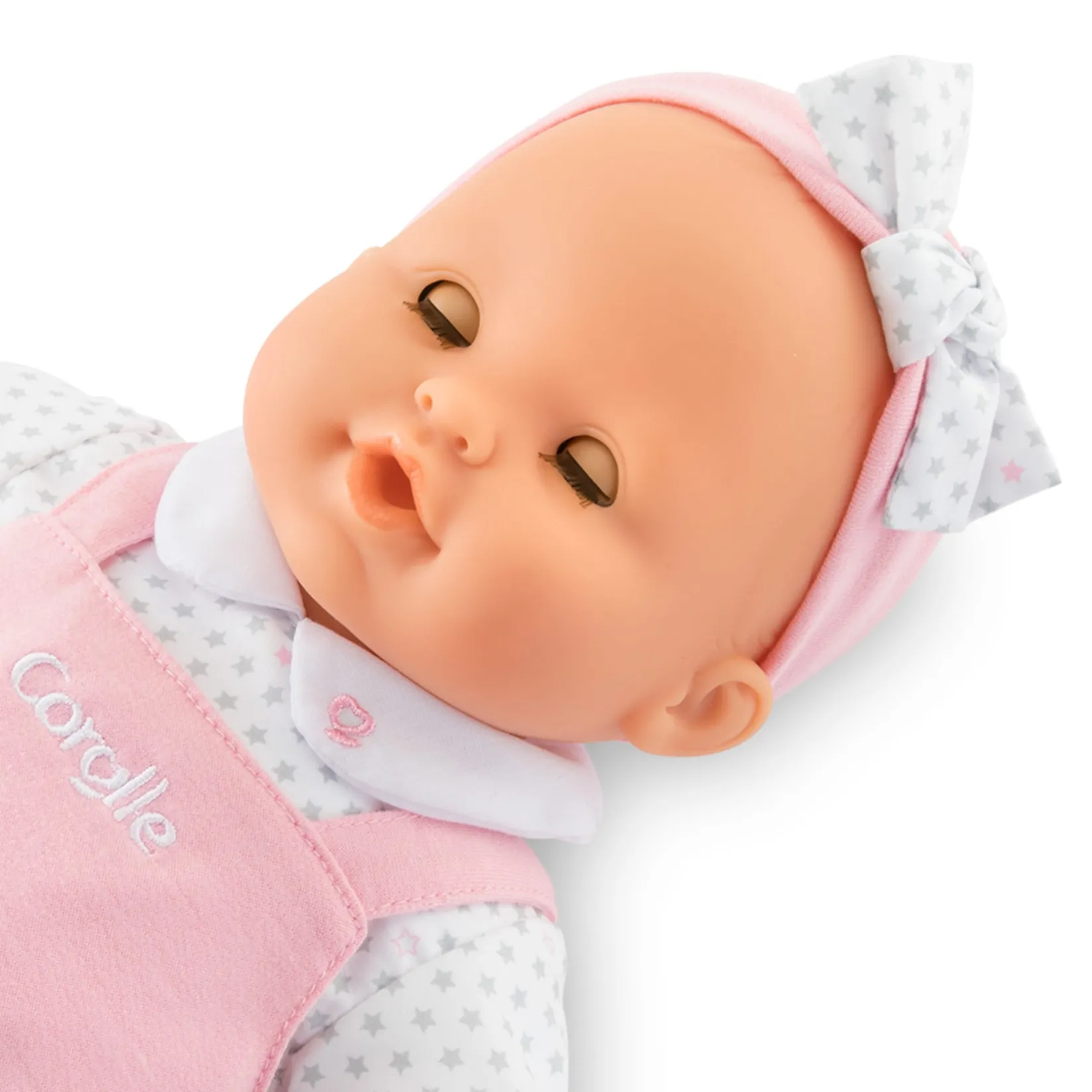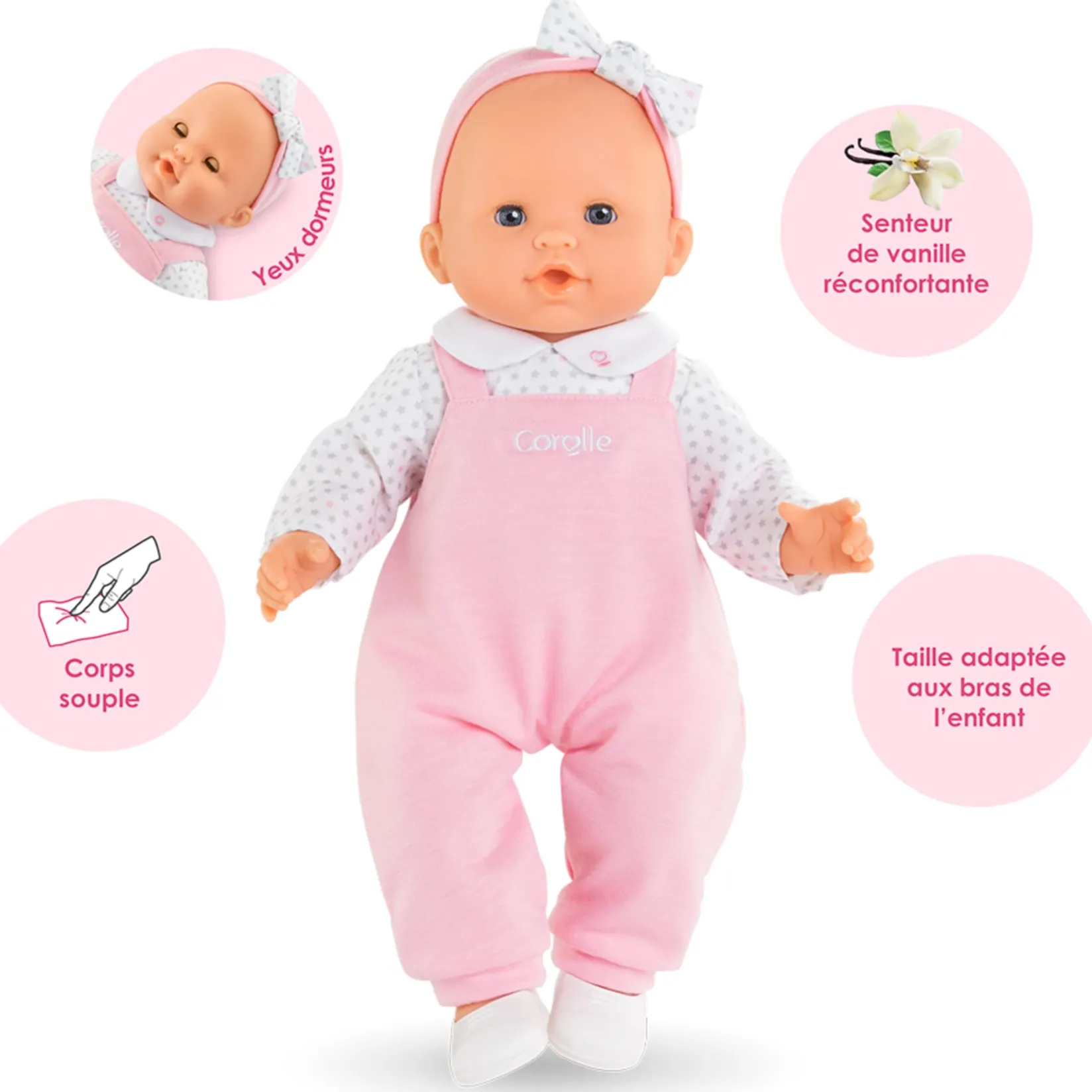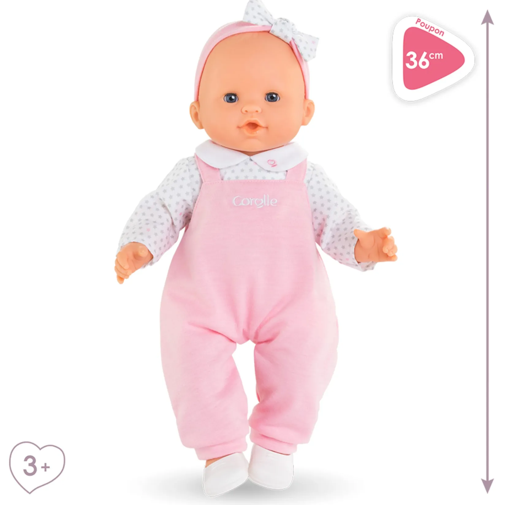 She measures 36 cm, a size perfectly suited to a child’s little arms for cuddling, mothering and reproducing the gestures that make you grow up. Lise has all the attributes of a Corolle doll: her face, arms and legs are made of soft-touch vinyl with a delicate, comforting vanilla scent. Her body is flexible for easy movement and she sits upright. Her thumb can be held in her mouth. This big doll has white skin and blue eyes. She also has sleeping eyes: she sleeps when you lay her on her back! Lise is dressed in pretty pink overalls and a long-sleeved white polo shirt, with a star pattern and a claudine collar. To complete her outfit, Lise wears a pink headband with a matching starry bow and a pair of white ballet flats.Â