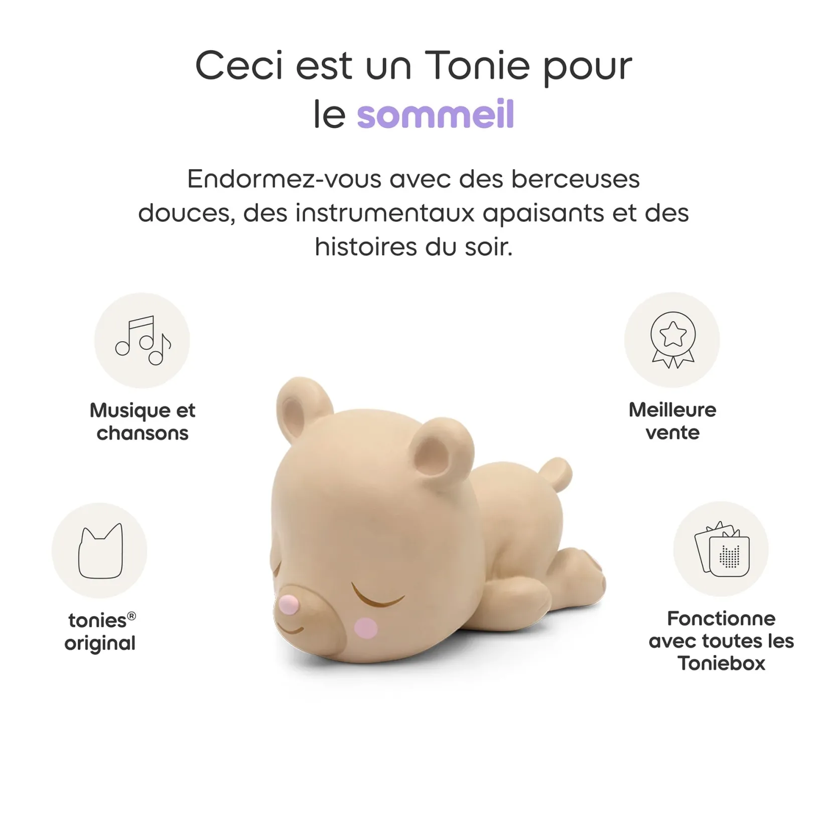 Create calming bedtime rituals with the Sleepy Friends collection. This Tonie features a wonderful bedtime story about Sleepy Bear’s journey home from Grandma and Grandpa’s house. On his way, he visits the squirrel, badger, rabbit, raccoon and many other animal families who are getting ready for slumber time themselves. Listen along to a soothing voice, rhymes, and repetition with a cozy atmosphere. And while the sun goes down in the slumber forest, the narrator and music also become quieter and quieter, helping little listeners drift off to sleep. This Tonie teaches: being true to yourself, bedtime routines, and strengthening family bonds. Please note: the content of this Tonie is entirely in French.