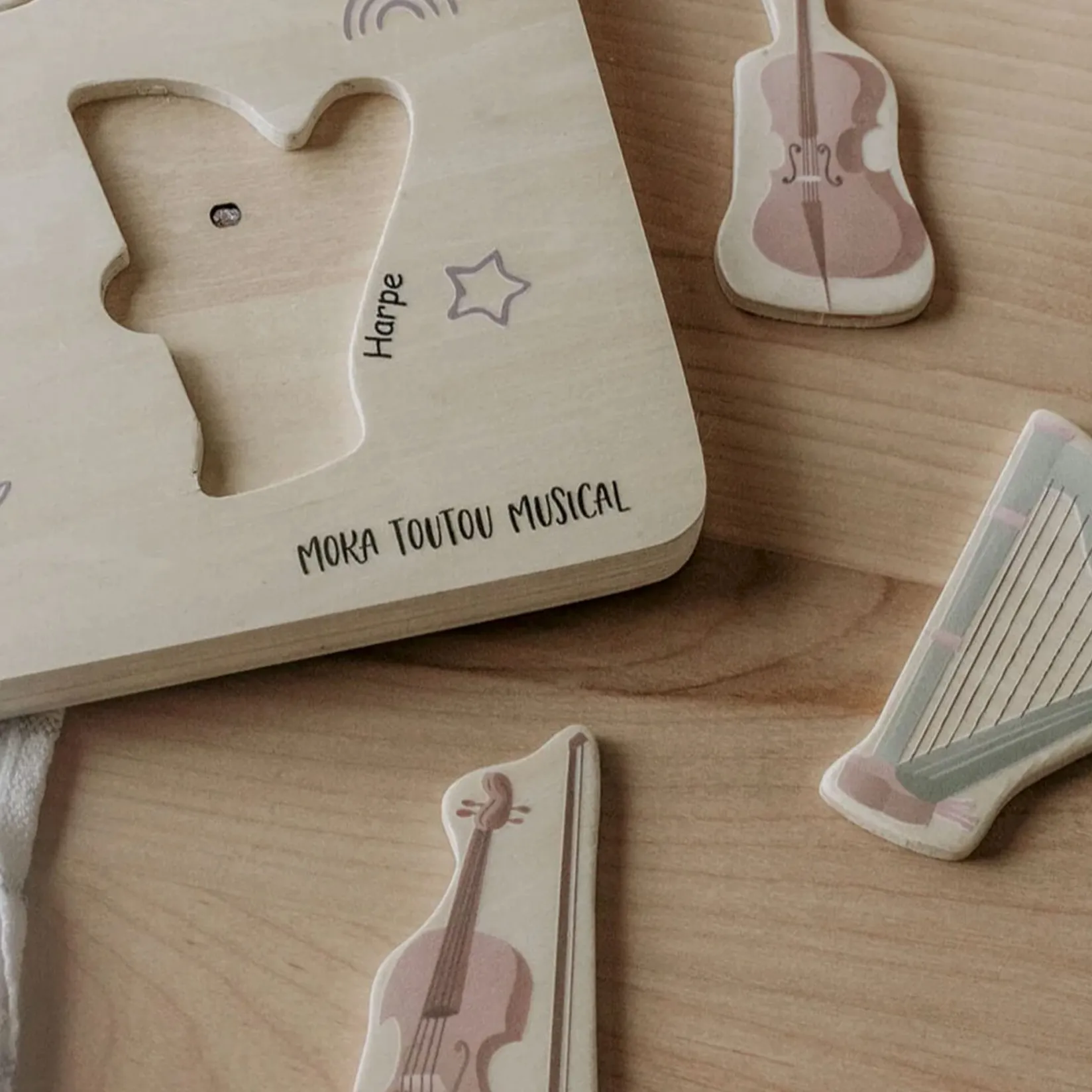 Find the 7 musical instruments from the picture book in the form of a musical puzzle. Just like the bear Moka, all the sounds you hear come from REAL classical musical instruments! Discover an excerpt from the lullaby “Jules” performed on the harp, flute, trumpet, and more!