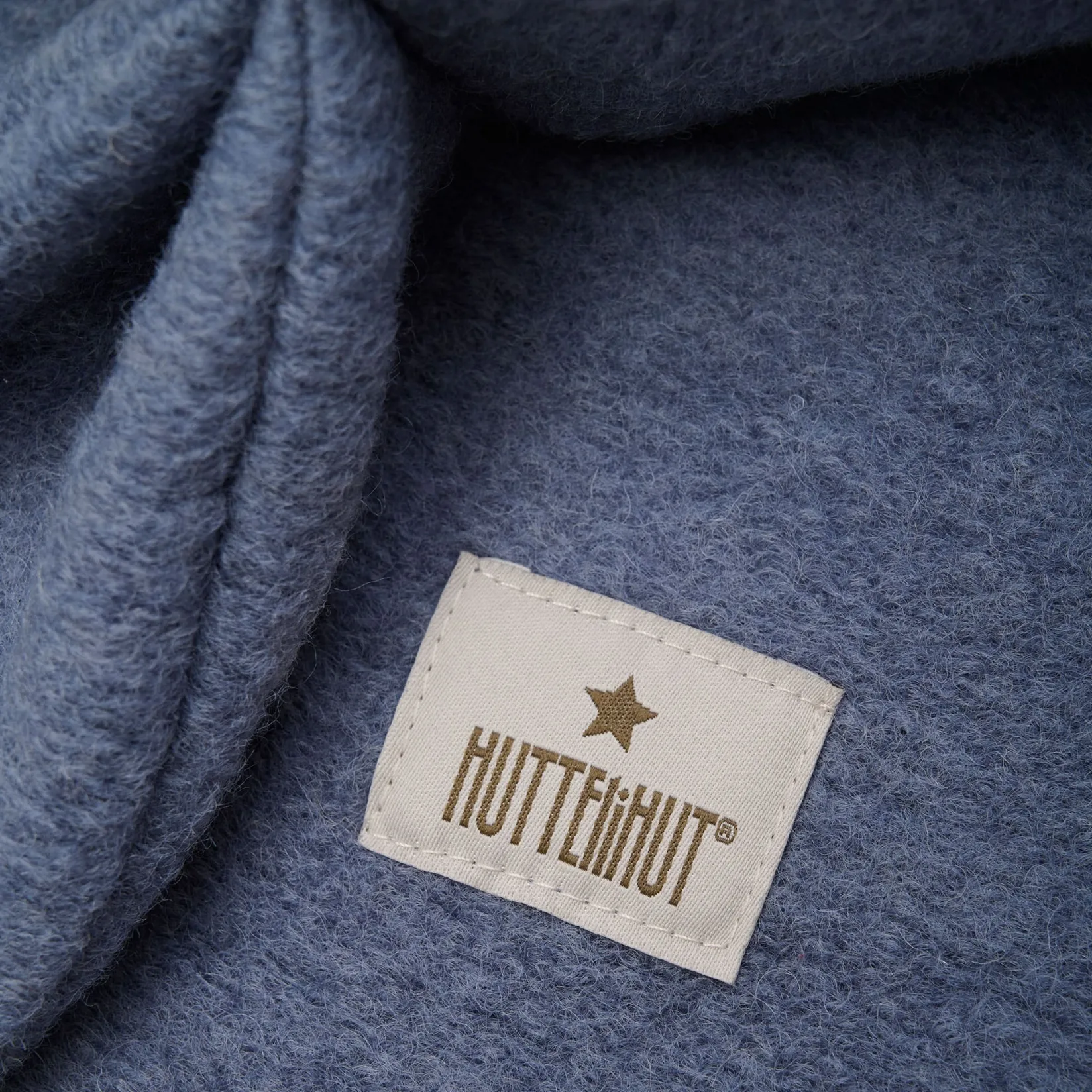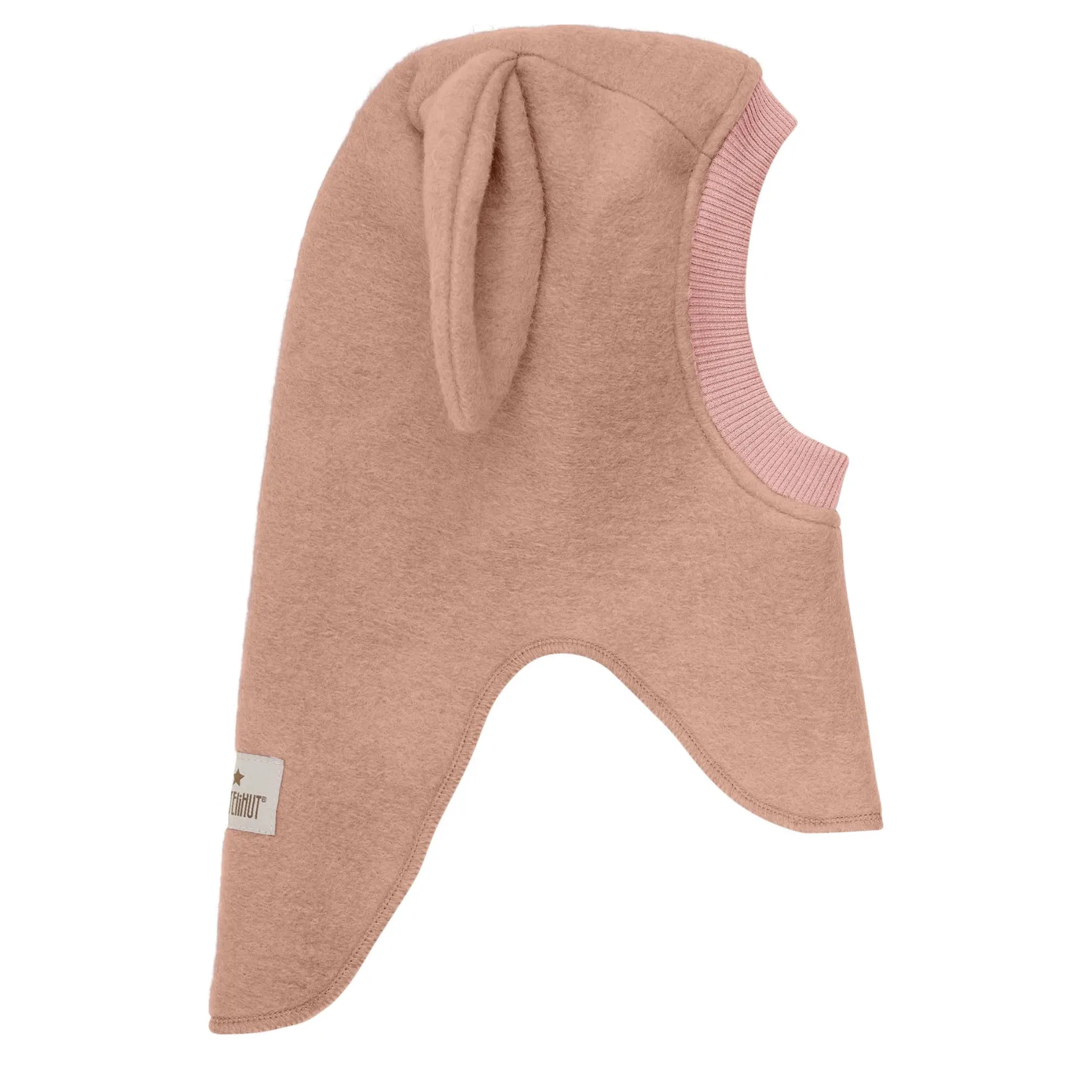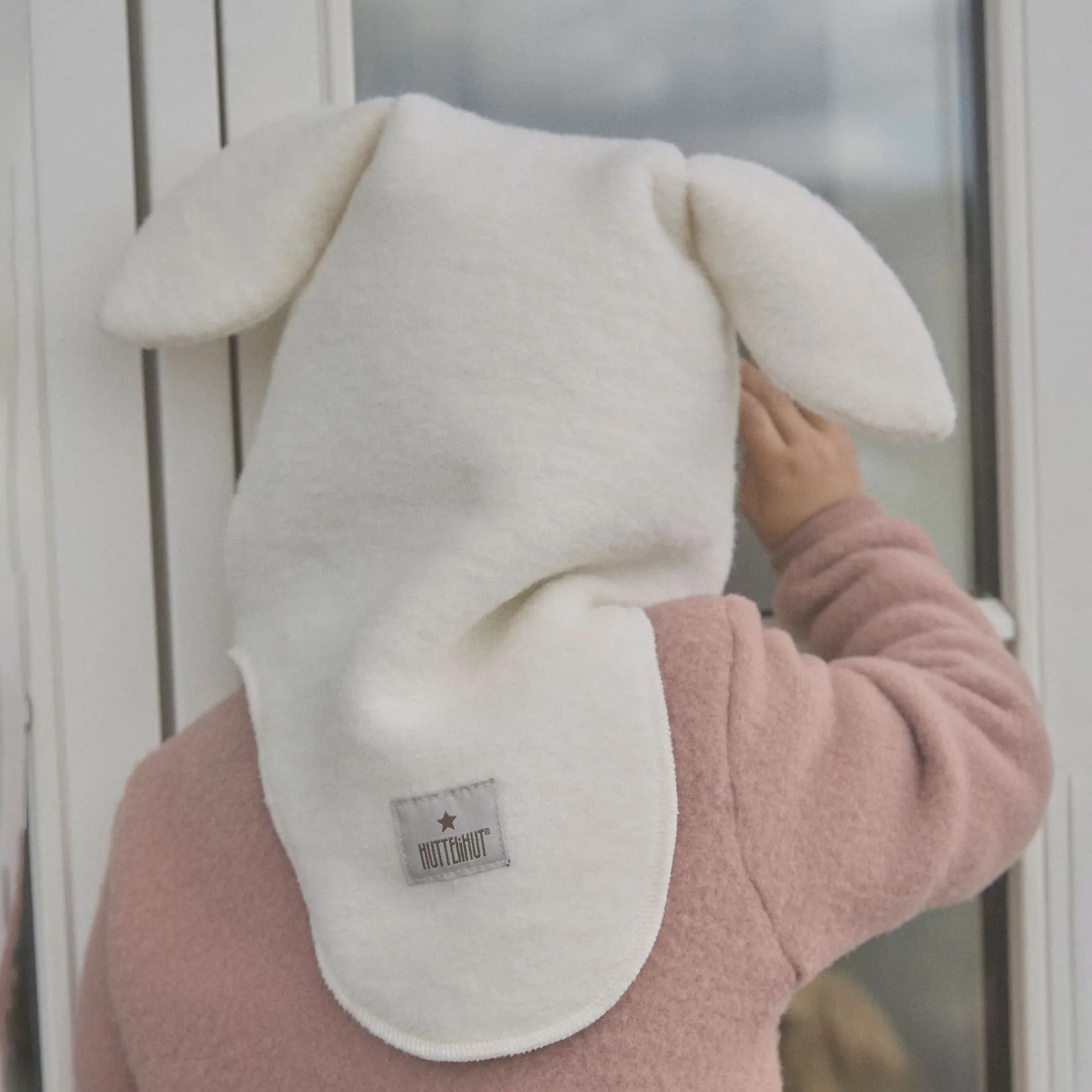 Lovely, warm, two-layer HUTTEliHUT balaclava with cute little bunny ears. The HUTTEliHUT balaclava has a wide, elasticated ribbed edge around the face, ensuring a secure fit. It features a practical split cut with extra length at the neck.The balaclava is made from a comfortable wool blend with a soft velvet lining.This product is made from wool, known for its durability when properly cared for: wash only when necessary. Use a gentle wool detergent. Do not use fabric softener. Always use the delicate wool cycle in the washing machine, turning the garment inside out. Use a gentle spin cycle. Reshape the garment while it is still damp. To hand wash, use lukewarm water and avoid wringing; gently squeeze with a towel to remove excess water. Dry flat on a towel.