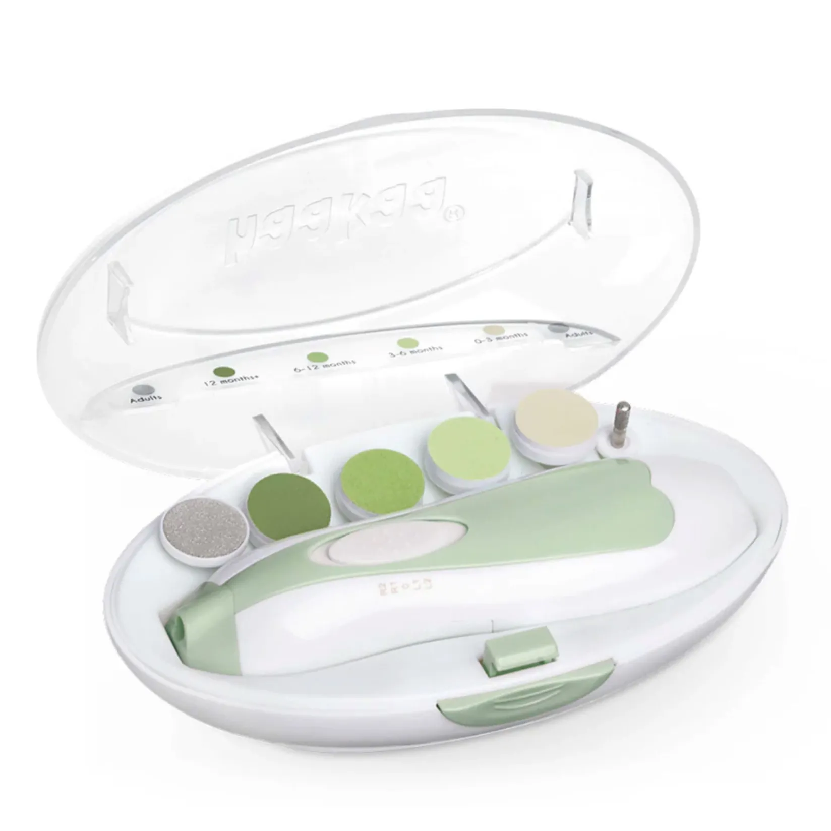 Attach the trimmer pad suitable for your child’s age and gradually file down their nails! The trimmer pads make your baby’s nails smooth and don’t leave sharp edges that may scratch their delicate skin. We’ve also included a metal pad and cone so parents can file down their nails too!