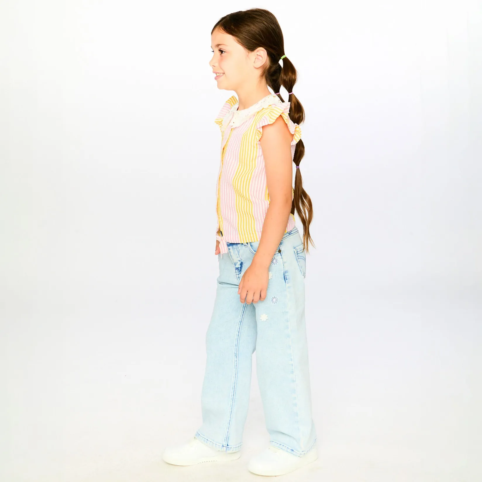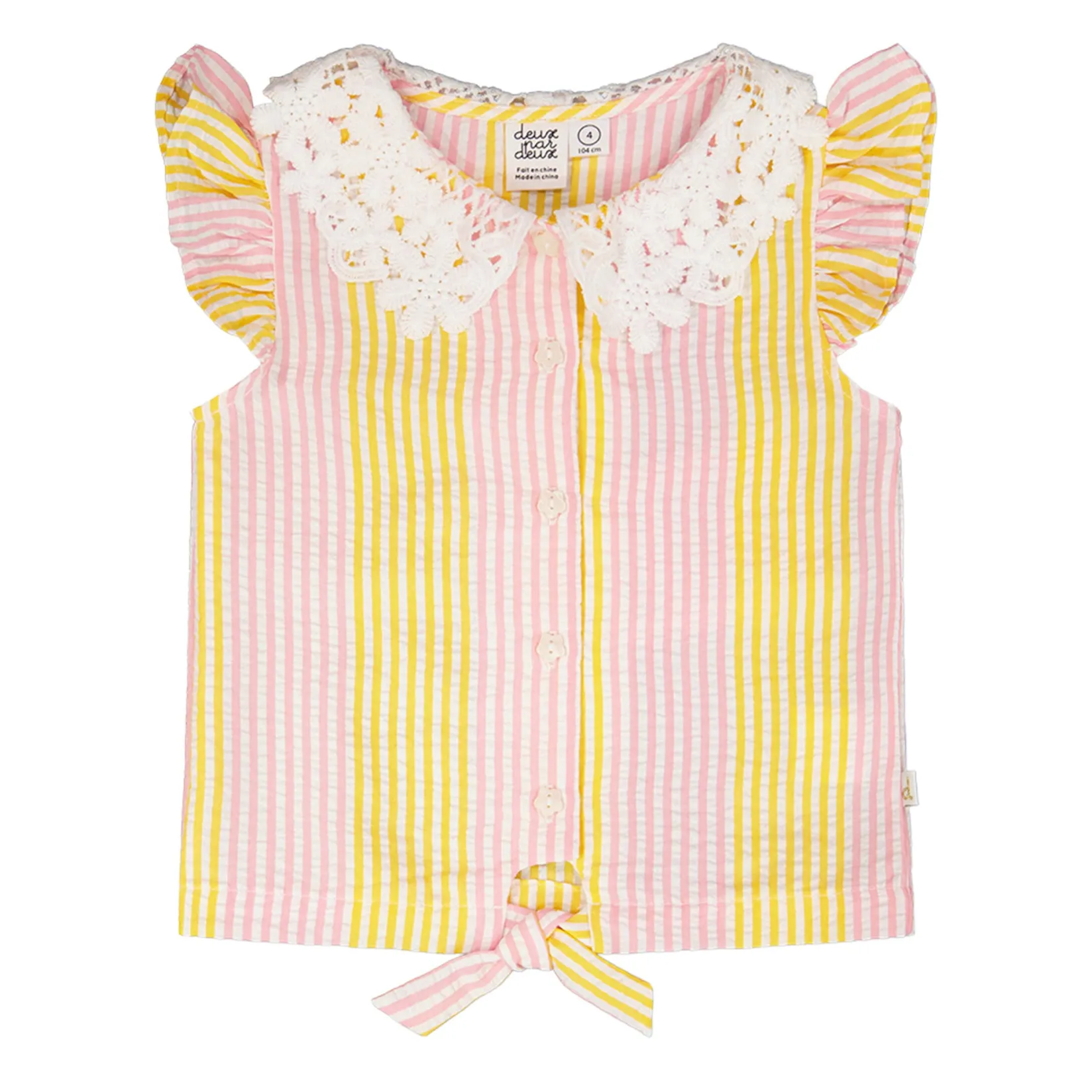 Fresh and stylish, our sleeveless shirt with pink and yellow stripes and a crochet collar is perfect for sunny days. This blouse features flutter details at the shoulders, a delicate crochet Peter Pan collar, a full front button placket, and a charming front tie knot for a playful twist. Part of the “Explosion of Daisies” collection, it pairs beautifully with skirts, shorts, or pants for an effortlessly chic summer look.