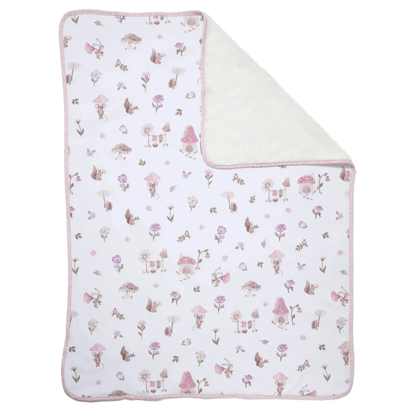 The gorgeous double-layered stroller blanket features a 100% cotton jersey Mushroom House print on one side, and the softest Sherpa on the other; perfect for keeping baby warm and cozy when out and about.