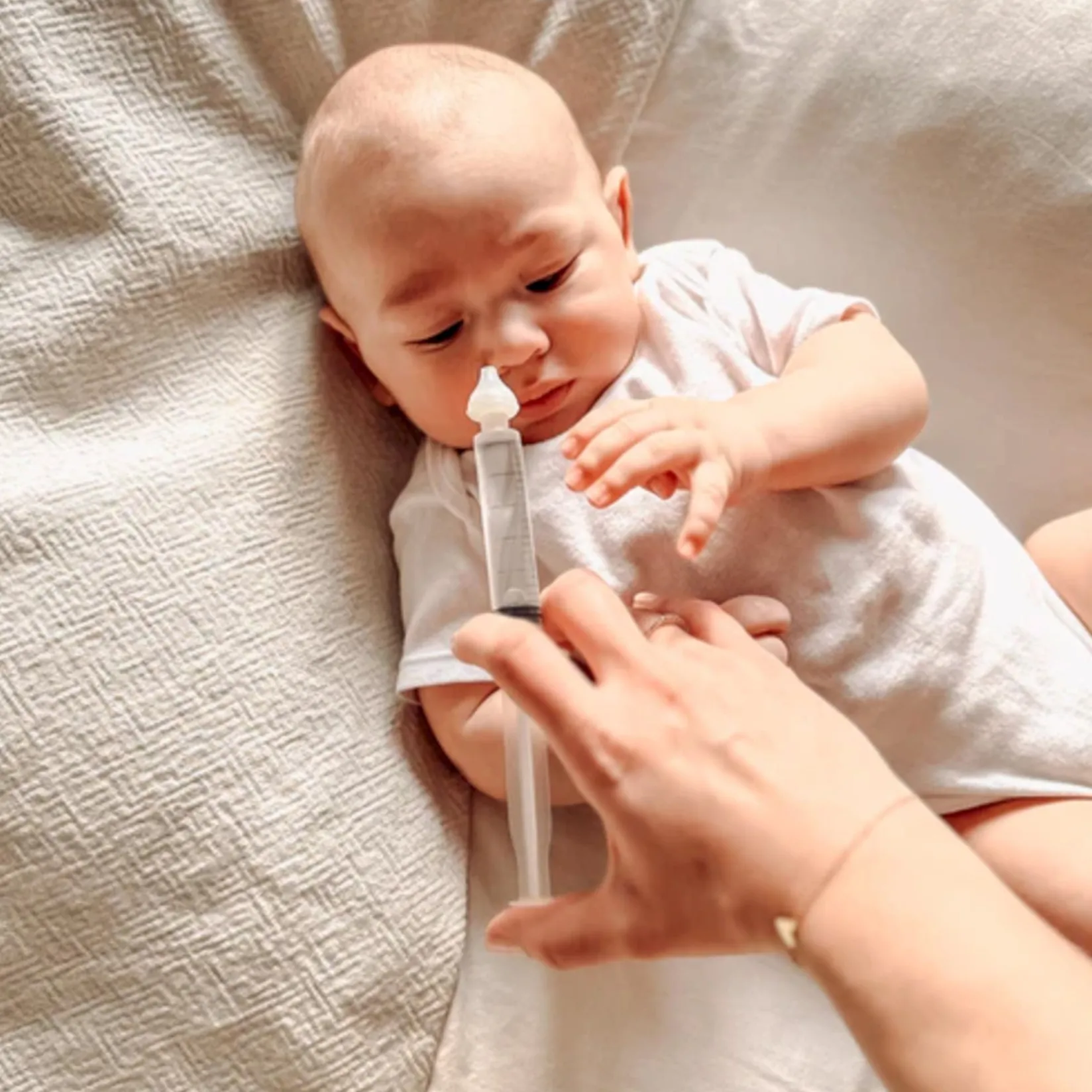 Lay your child on their side or back, swaddle if necessary, and place a washcloth under their nose. Irrigate the upper nostril when positioned on the side by gently emptying the syringe’s contents, about 1 mL per second. Secretions may come out through both nostrils, the mouth, or be swallowed. It is not necessary for the water to come out through the other nostril.