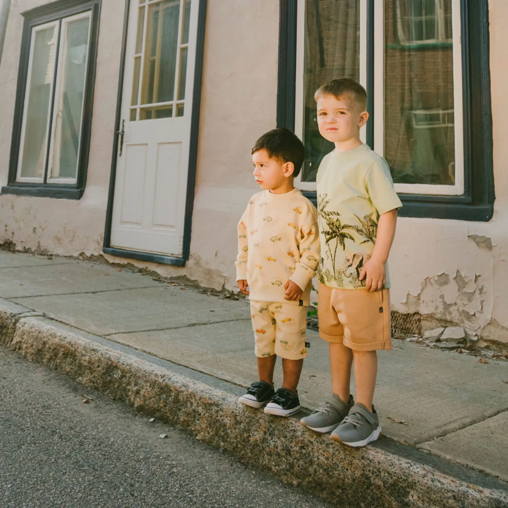 The French terry sweatshirt in beige with jeep print is designed for little explorers on the move. Made from a comfy blend of cotton and elastane, this crewneck sweatshirt with ribbed trims offers softness with just the right amount of stretch. With its allover jeep print, it’s part of our “Trail Buddies” collection and brings playful energy to everyday adventures.