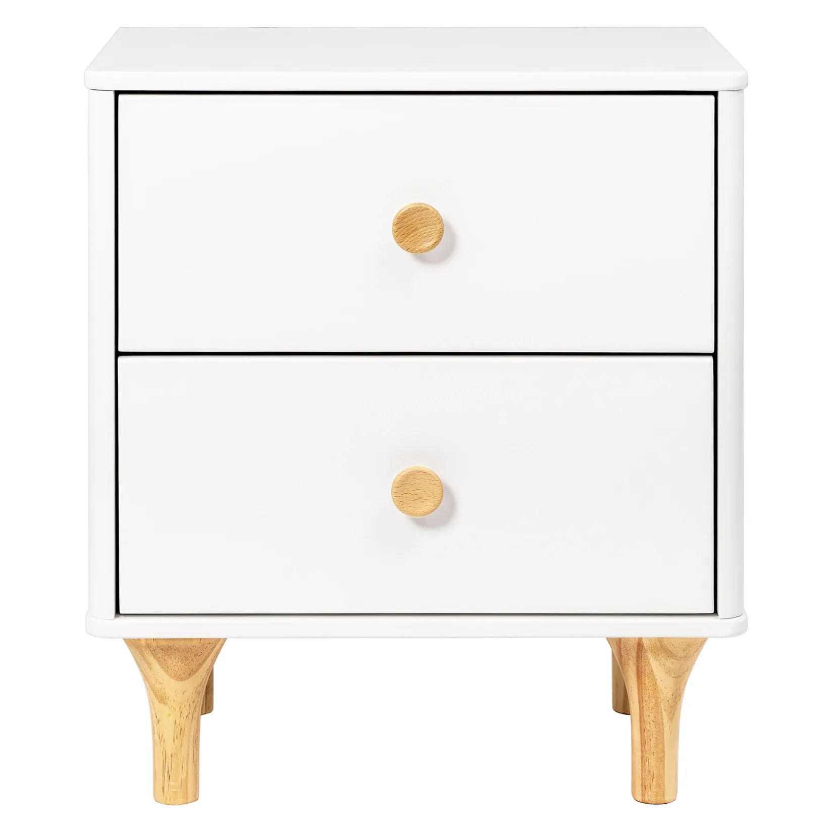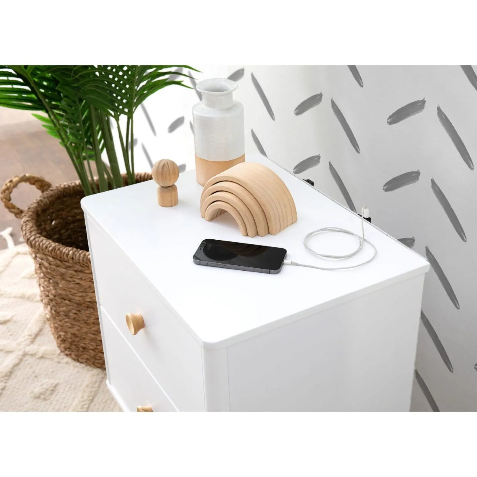 The Lolly Nightstand with USB port is a playfully modern addition to a nursery or kids’ bedroom with gently curved corners, natural wood accents, and two smooth-glide drawers. Easy setup with minimal assembly required.