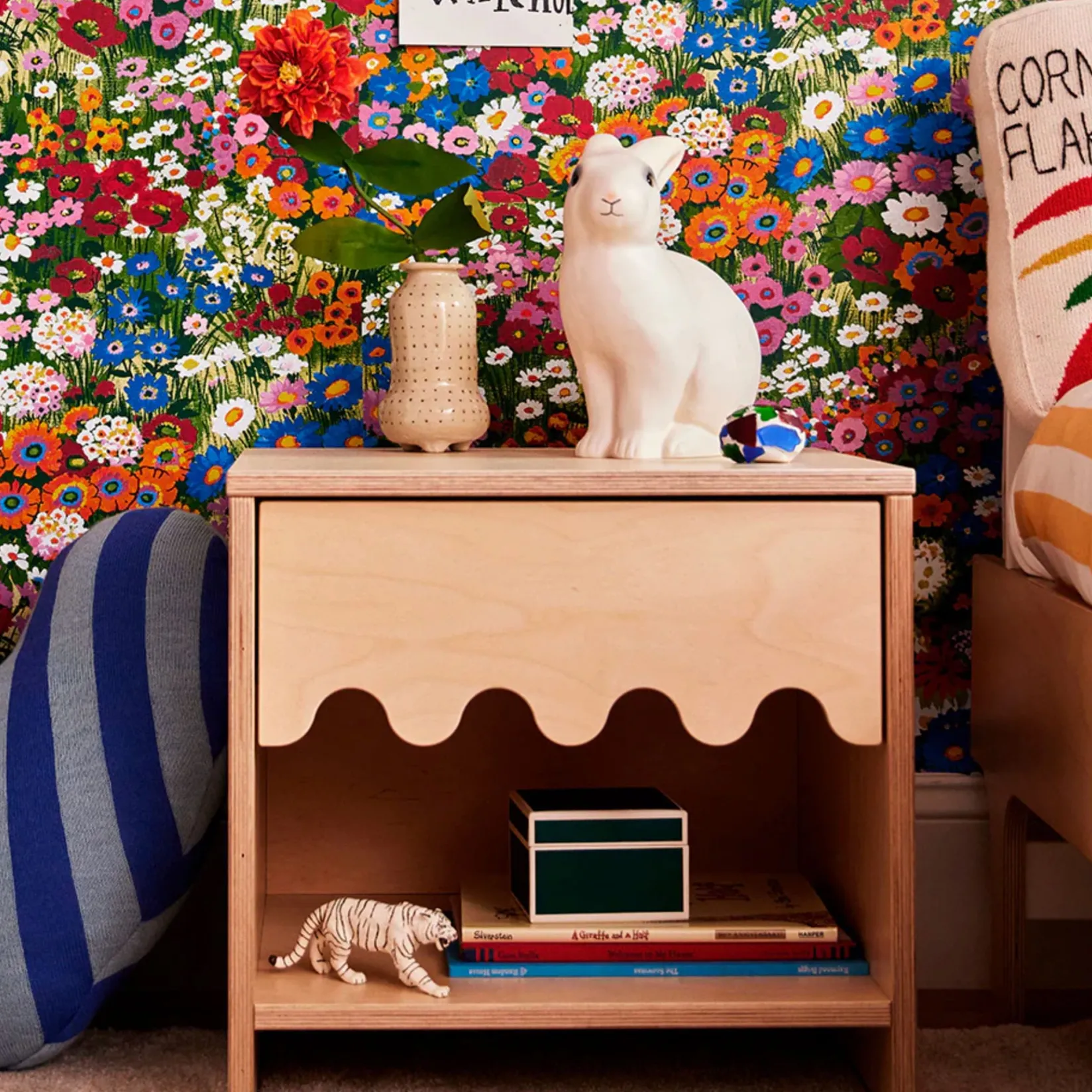 The Oeuf Moss Nightstand features a bold-yet-simple wave motif that’s an instant statement in any room, whether minimalist or maximalist. It smartly provides both open and closed storage, including a drawer to contain clutter