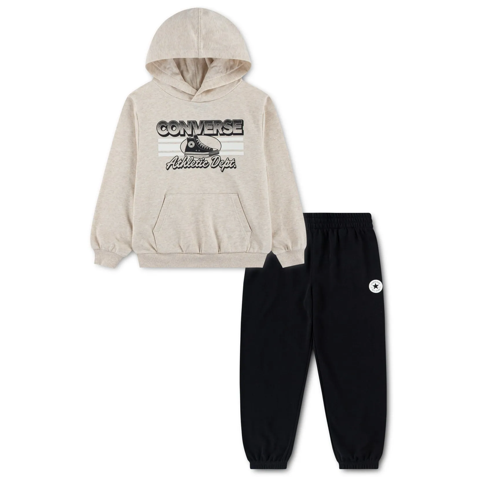 Easily dress your little All Star in cozy style with this two-piece French terry set. The hoodie features a Chuck Taylor sneaker and wordmark logo graphic, and dropped shoulders that relax the fit. The matching joggers have a stretchy waistband for a comfy fit and relaxed, tapered legs that spotlight your kids’ favorite pair of kicks.