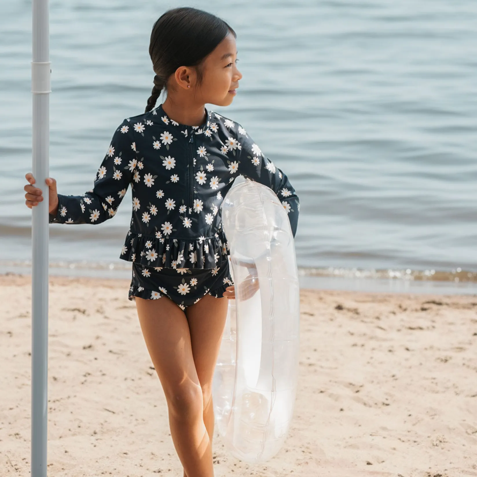 Bringing a classic summery style to a pool or beach near you, this Daisies print rash guard set is perfect for splashing in the pool or building sandcastles at the beach. The 2-piece set includes a long-sleeved rash guard and high waisted pants, both helping to keep her delicate skin covered in the sun. Made with quick-drying weft knitted fabric, the set is comfortable wet or dry and is designed with UPF50+ sun protection. The cheerful set is stretchy, practical and fun, giving her the confidence to play freely on sunny days.Â