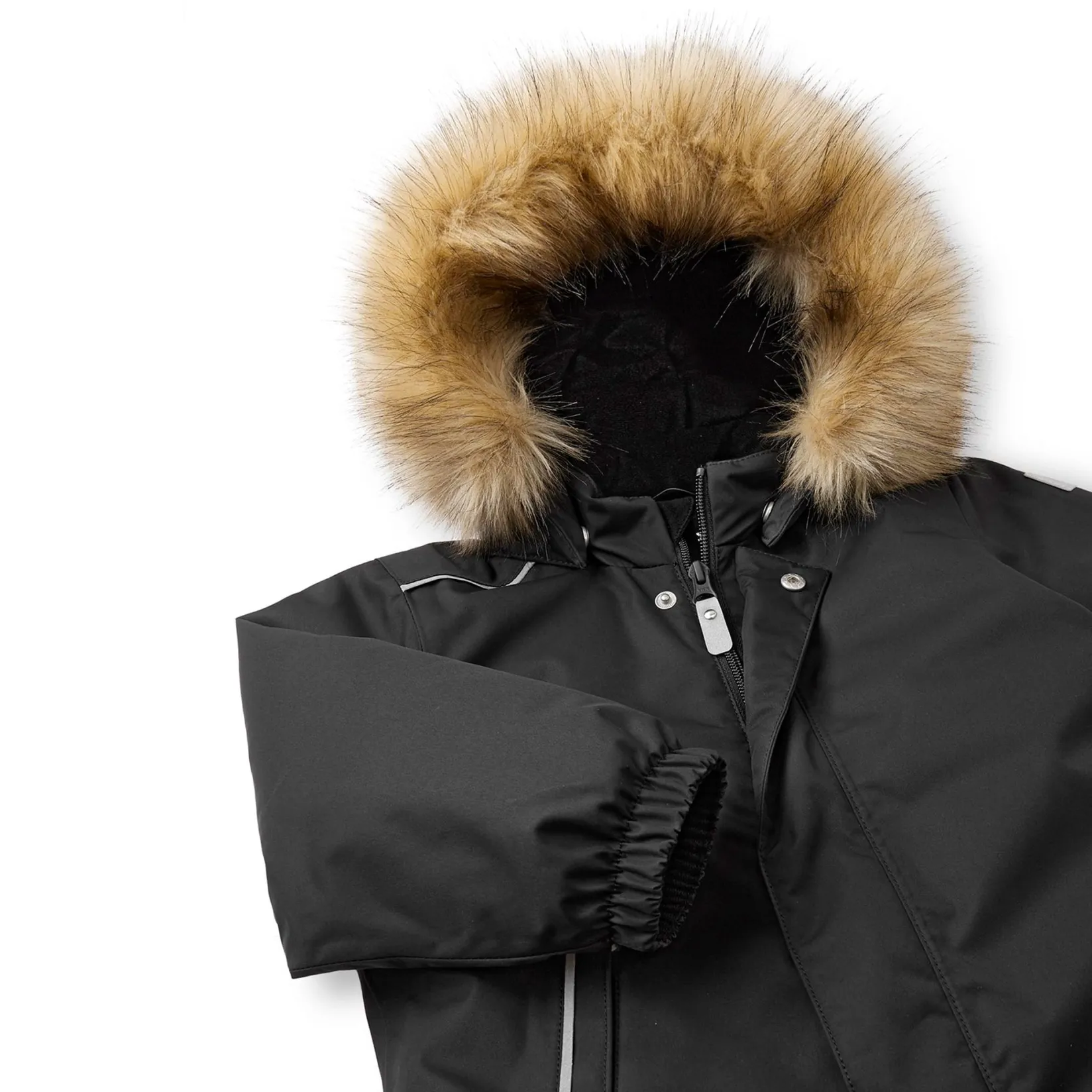 -Safe, detachable and adjustable hood with detachable faux fur trim
