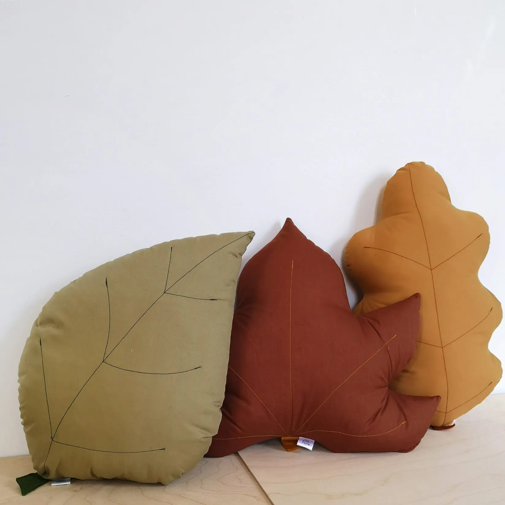 Coussin décoratif en forme de feuille de frêne inspiré de la forêt pour une décoration de chambre bébé sur le thème de la nature.