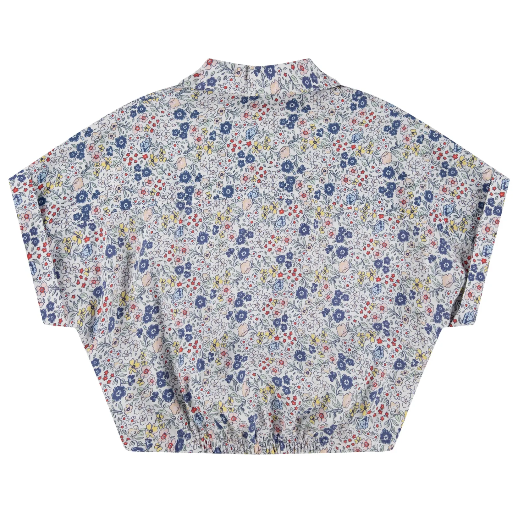 Features: Short sleeves with roll-up cuff, Shirt collar, Buttoned front, Floral print, Cropped, bell cut, Elastic hemline