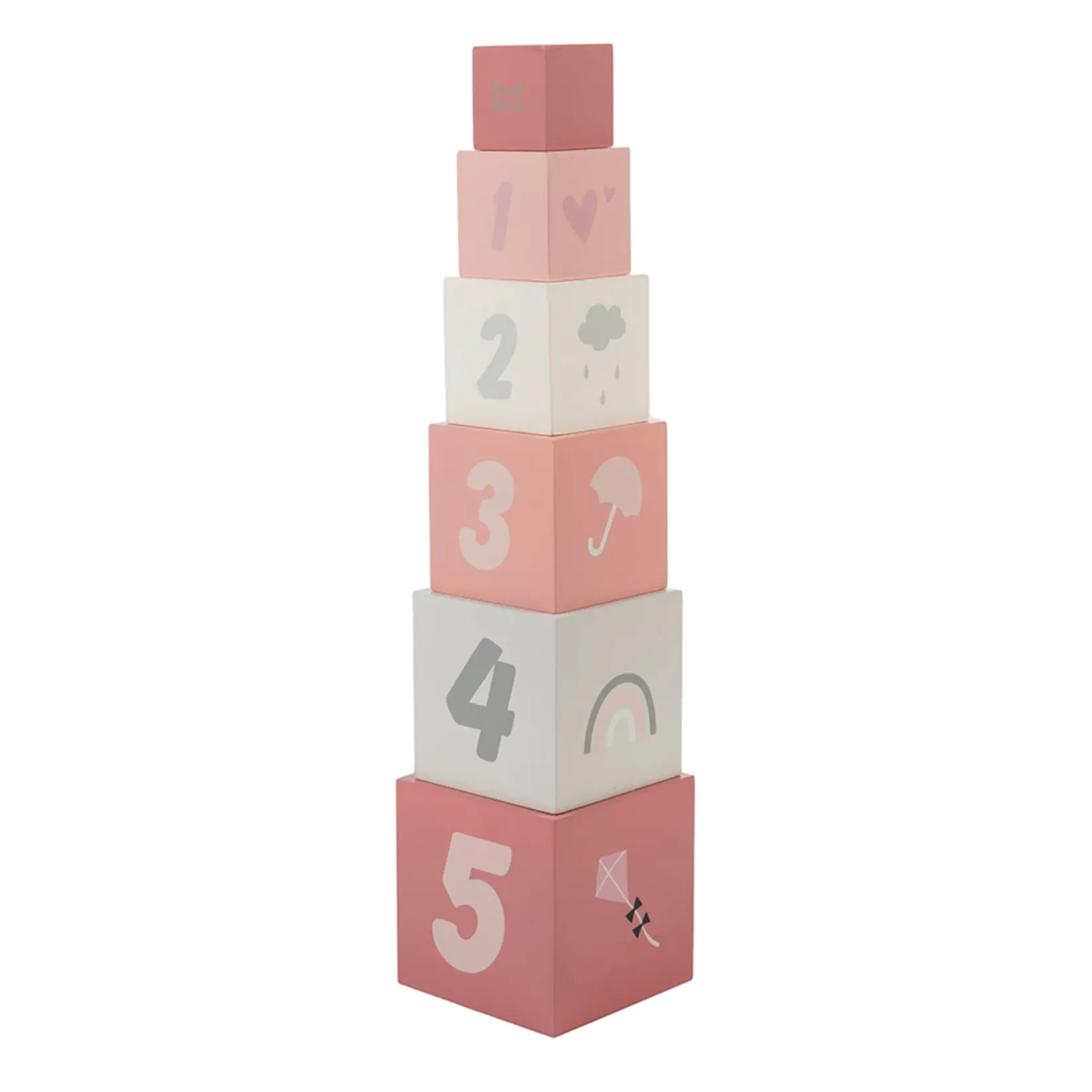 The numbered stacking & nesting blocks are made of high-quality FSC beech wood and were applied with beautiful pink, white and grey tones using child-friendly water based paint. With these wooden stacking blocks in the label Label house style, your toddler can stack, build and assemble to his heart’s content. The 6 wooden blocks of decreasing size that fit or can be put together, have a different number on two sides, on the other sides you find patterns and symbols. While playing your toddler will practice his imagination, logical reasoning and eye-hand coordination as well as recognize numbers.