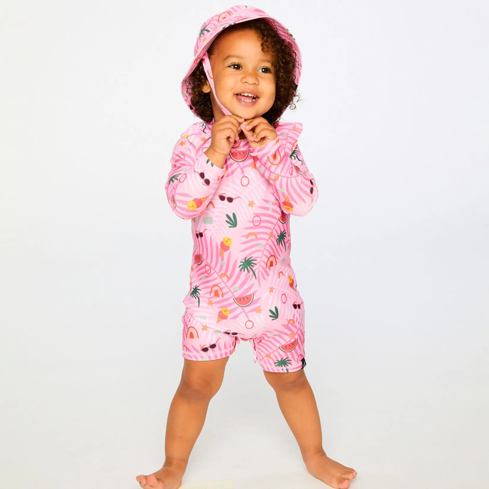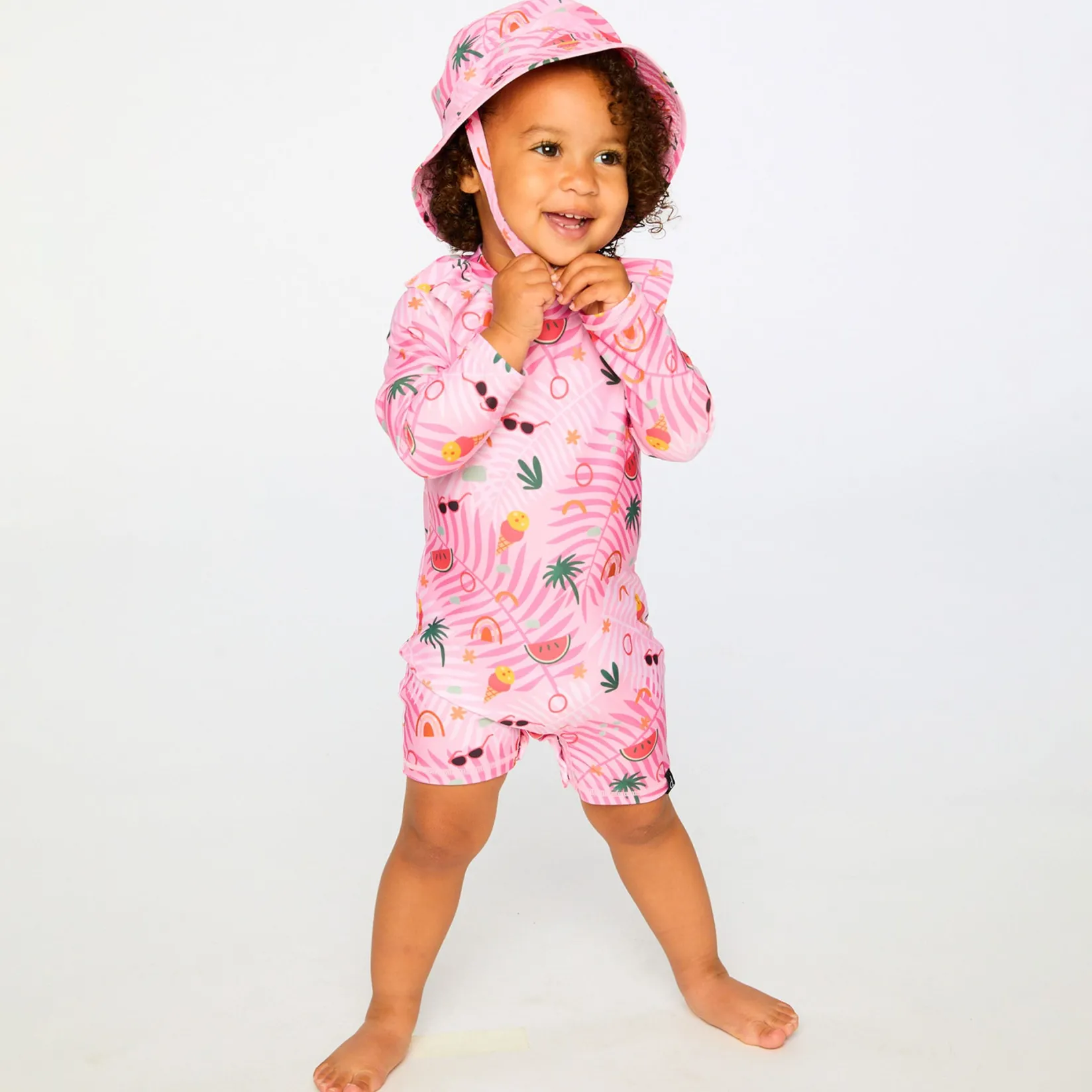 Bring a bloom of charm to sunny days with this beach hat in purple with flower print. Designed with wide brim protection and a pretty allover floral motif, this hat adds both style and shade to outdoor fun. The practical chin straps keep it securely in place, while the recycled polyester fabric with soft lining ensures comfort all day long. Pair it with any outfit from our “Like A Fish To Water” collection. Please note that there are no drawstrings in children’s size 2/3 & 4/5.