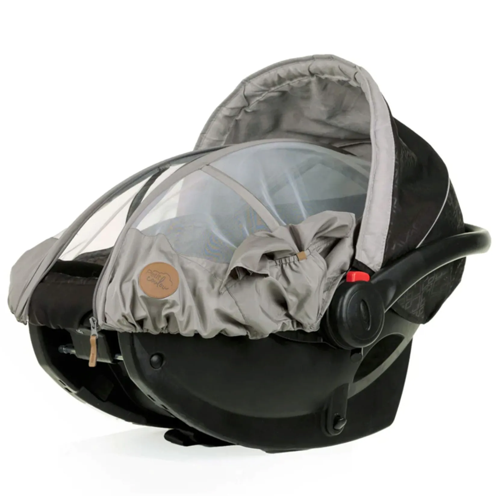 Thanks to its elasticated contour, it fits perfectly to the baby car seat, ensuring optimal protection without compromising flexibility. Its unique bouncy ribs allow it to maintain its shape, creating a clear space around baby while protecting him from external elements that could come into contact with him.