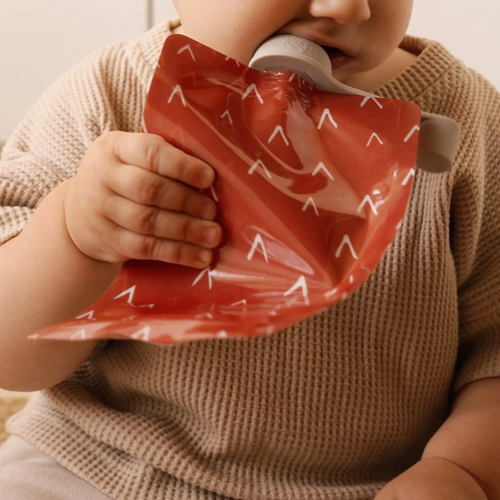 -Reduce mess: Flow control valve to prevent spills. Because it’s very challenging for our little ones to eat with a spoon, pouches significantly reduce mess.