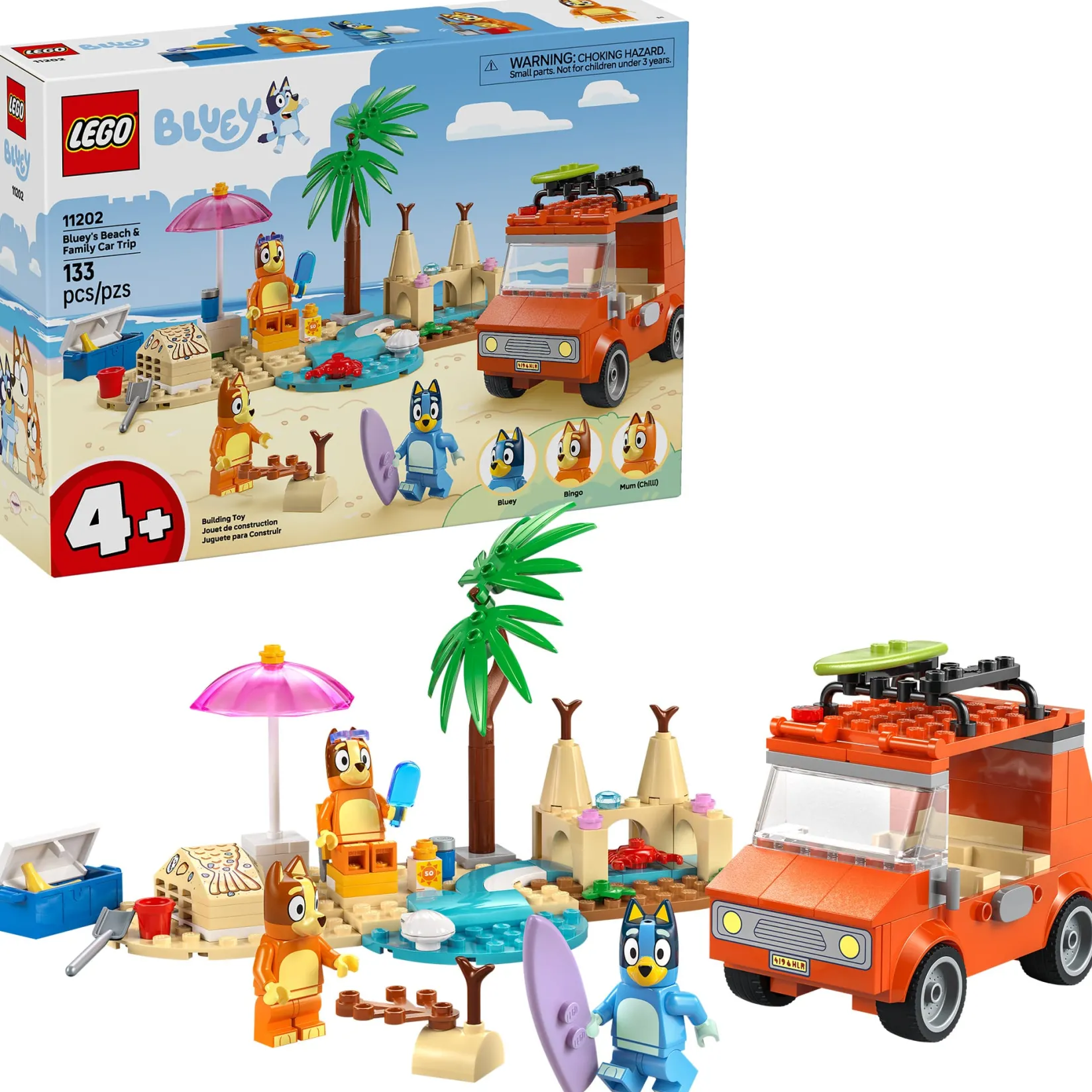 Bluey, Bingo and Chilli, Bluey’s mom, load up the car for a beach trip in this LEGO® Bluey playset for kids aged 4 and up.