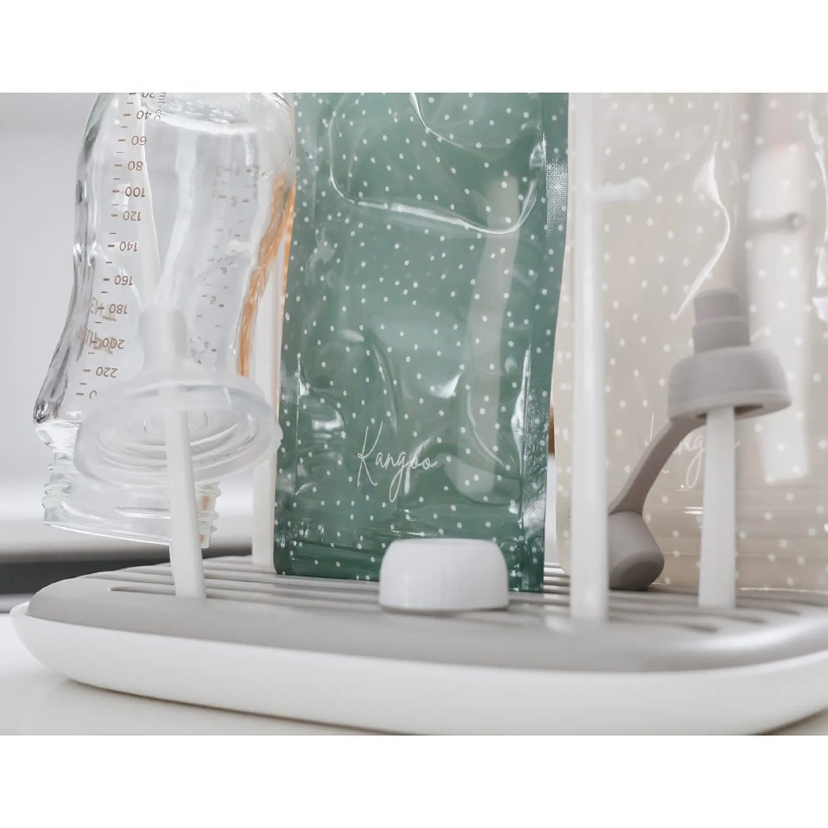 Our lovely BPA-free greige-colored drying rack is perfect for drying your reusable food pouches, bottles, bottle nipples, bottles, and other accessories.