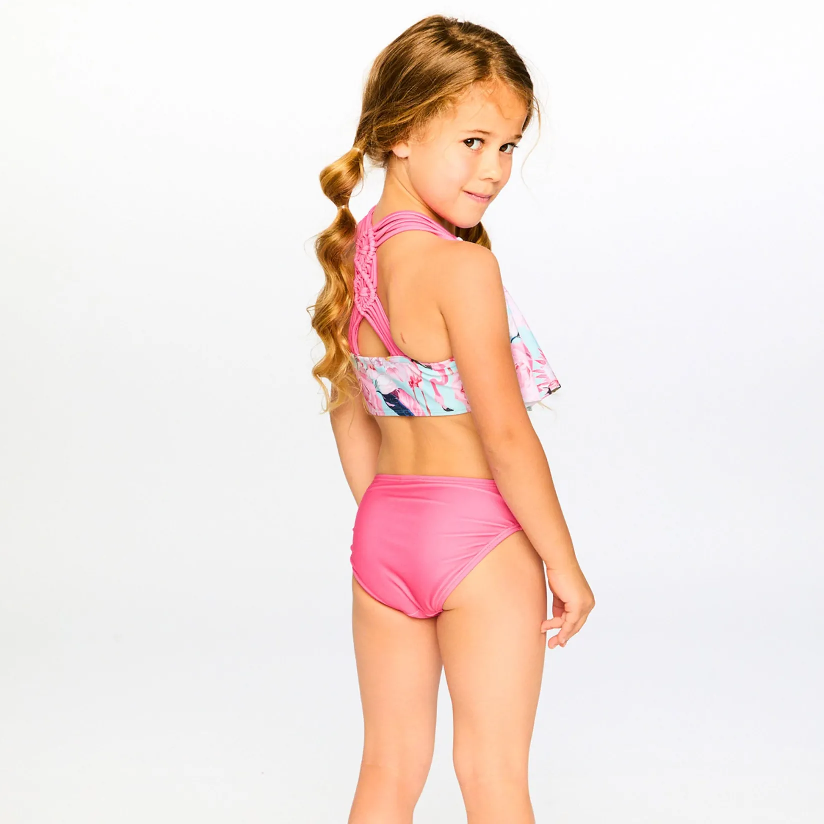 Chic and breezy, this two-piece swimsuit in blue with flamingo print is perfect for splashing around in style. This two-piece set features a flounce top with a wide ruffle, intricate triple straps at the back, and a macramé detail for a playful touch. The solid pink bikini bottom completes the look with adjustable side ties for added comfort.