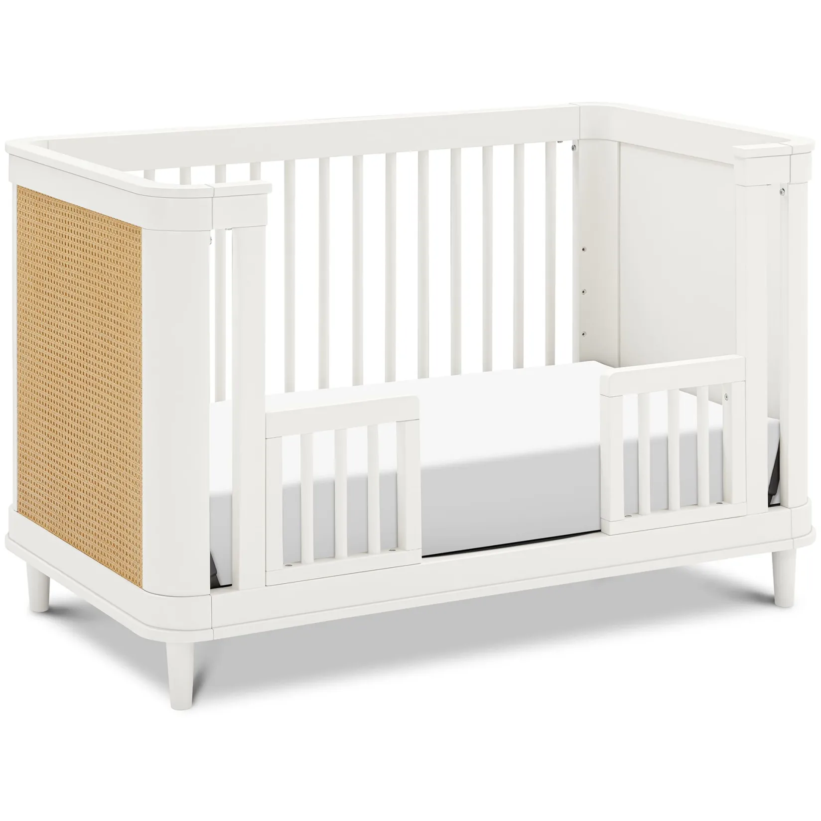 Ease into contemporary style with the Marin 3-in-1 Convertible Crib. Featuring a gently curved silhouette with solid rounded cane side panels, the Marin is an effortlessly transitional piece for the home. Crib converts to a toddler bed and daybed, and fits any standard full-size crib mattress. convertible