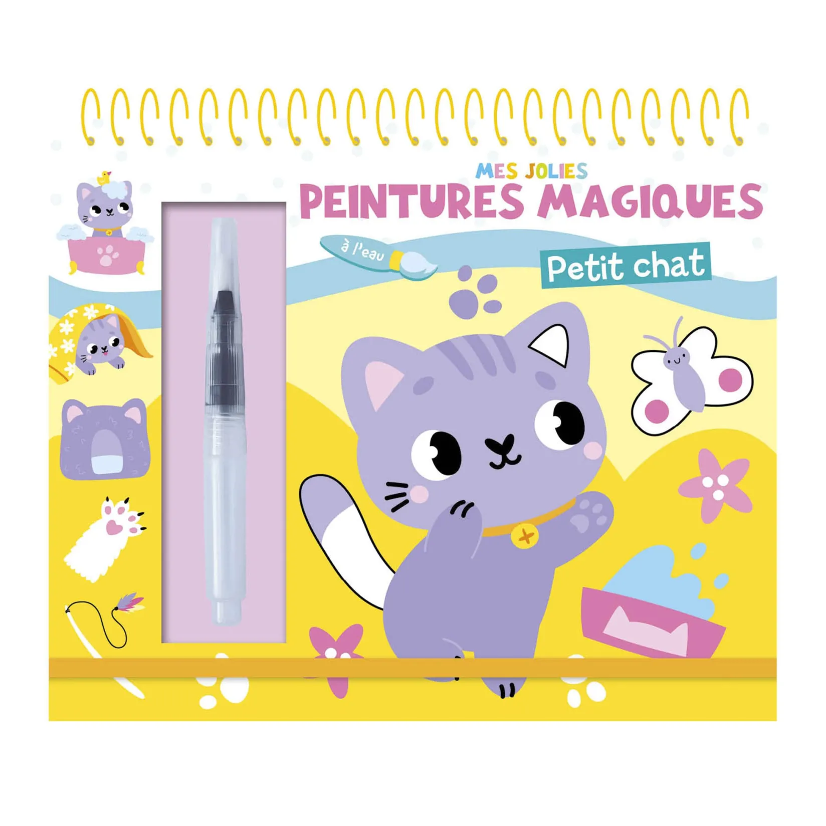 A magic painting book with a water reservoir brush and erasable ink. Includes 7 beautiful illustrations and 7 “seek and find” activities. Toddlers no longer need an apron for painting. Simply fill the brush’s reservoir with water, then brush over one of the drawings and watch vibrant colors appear like magic!