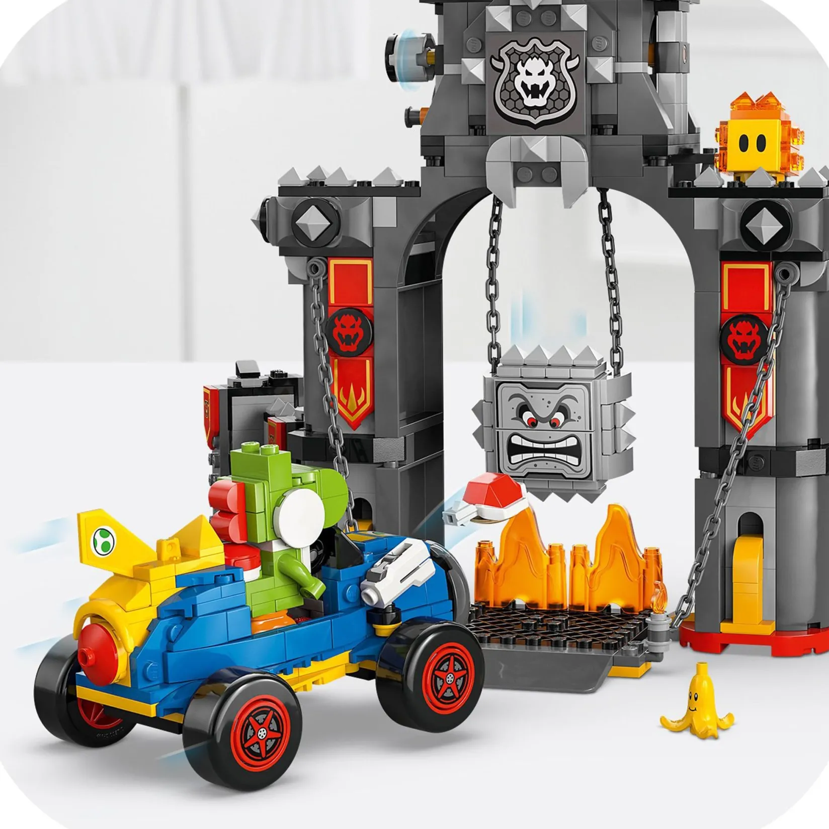 Get ready to race through Mario Kart™ – Bowser’s Castle with this LEGO® Super Mario™ racing set for kids (72039). A fantastic Nintendo® toy for boys, girls, and gamers aged 9 and up, it features Bowser’s Castle with a platform for Bowser to stand on, collapsible walls, a rotating fire bar, and more fun functions. Drive, drift, and launch shells with Bowser in the Standard ATV and Yoshi in the Mach 8 kart, smash the castle walls, dodge the diving Ka-Bang, and topple the Lava Bubble.