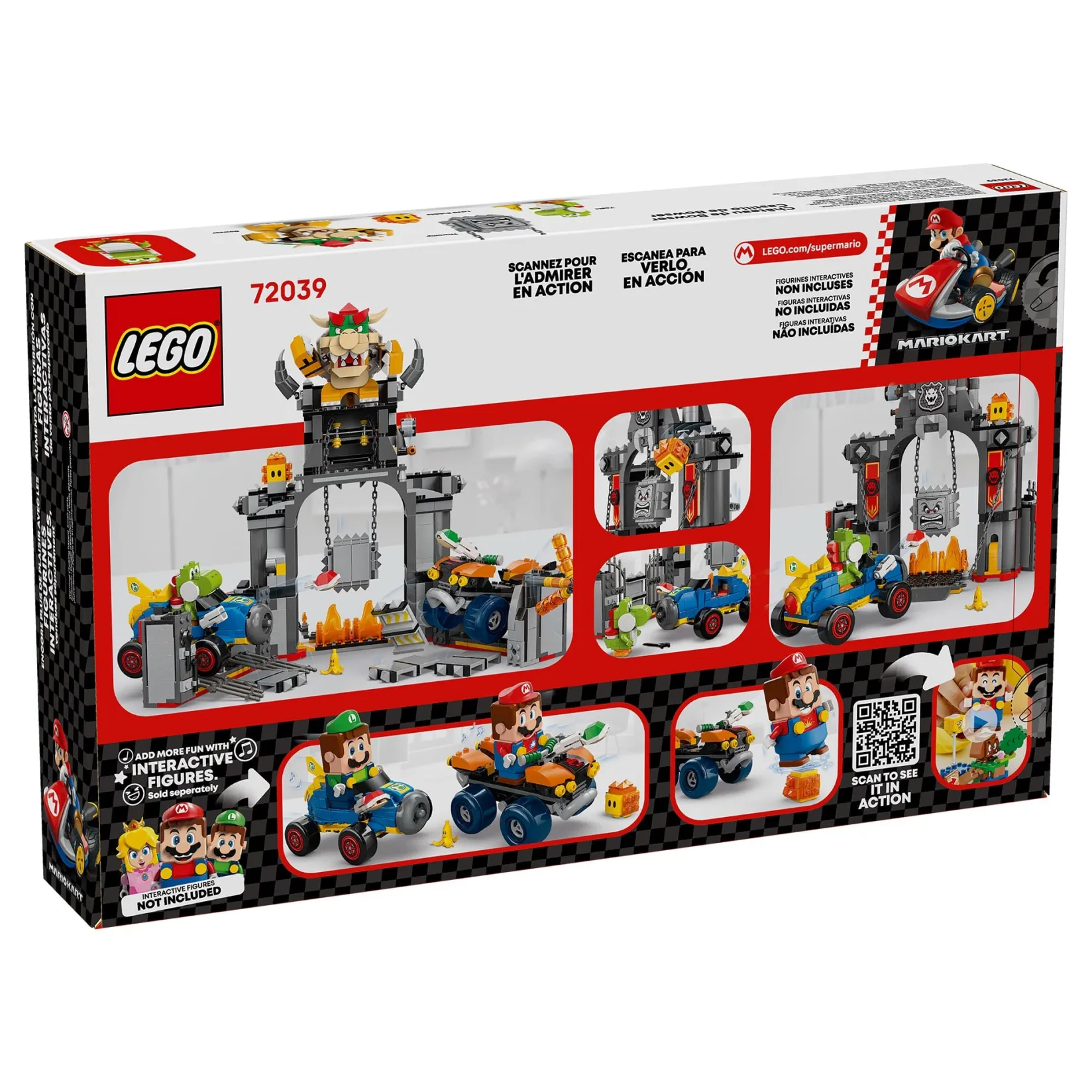 This set includes 4 LEGO Super Mario figures: Bowser, Yoshi, a Ka-Bang, and a Lava Bubble. Add a LEGO® Mario™, LEGO® Luigi™, or LEGO® Peach™ figure (from sets 71439, 71440, 71441 or 72043 – sold separately) for interactive play, featuring Mario Kart™ sound and visual effects when characters drive the vehicles.