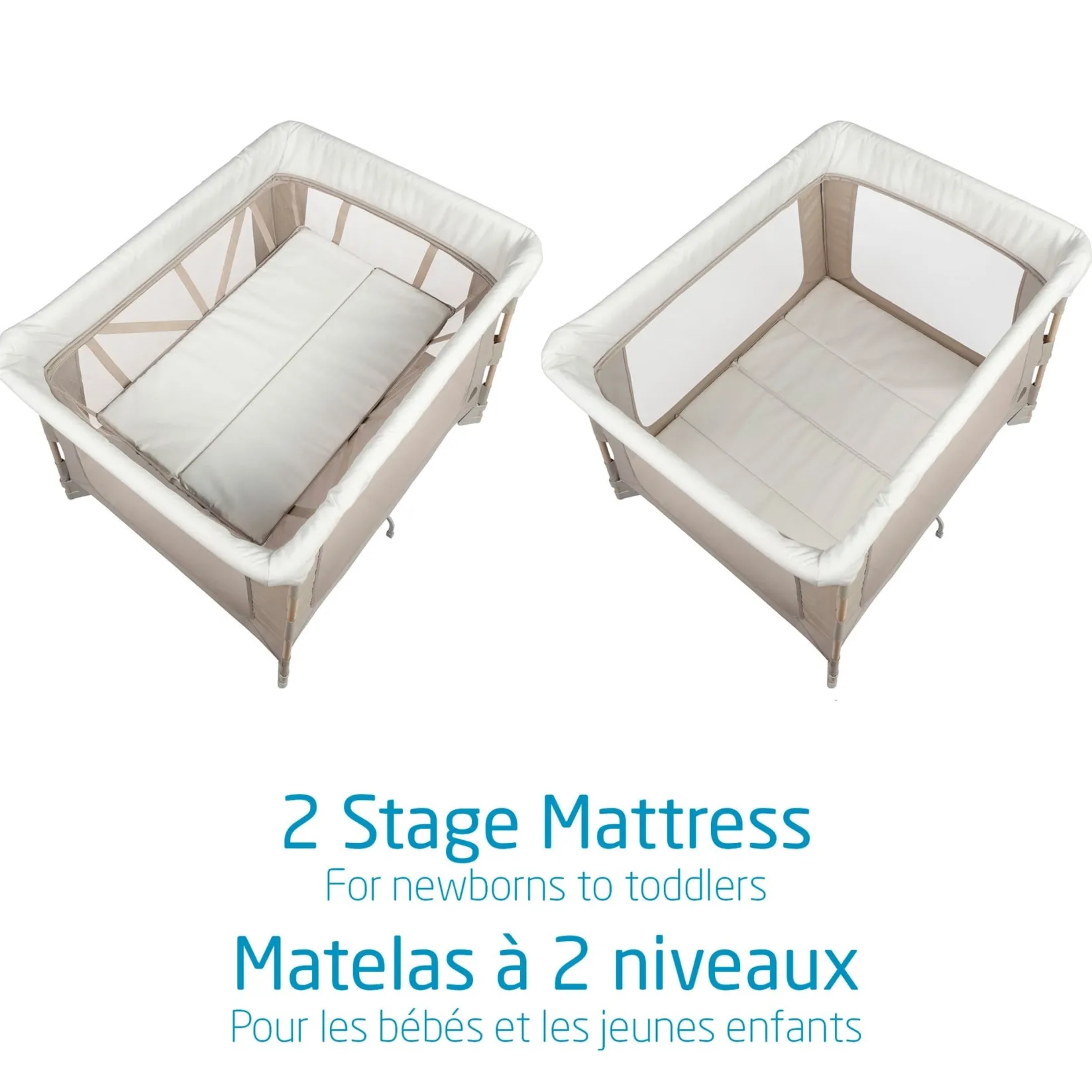 -2 Stage Mattress; This unique and comfortable mattress unzips to fit the bassinet and zips back together to create a larger mattress for the play yard.”