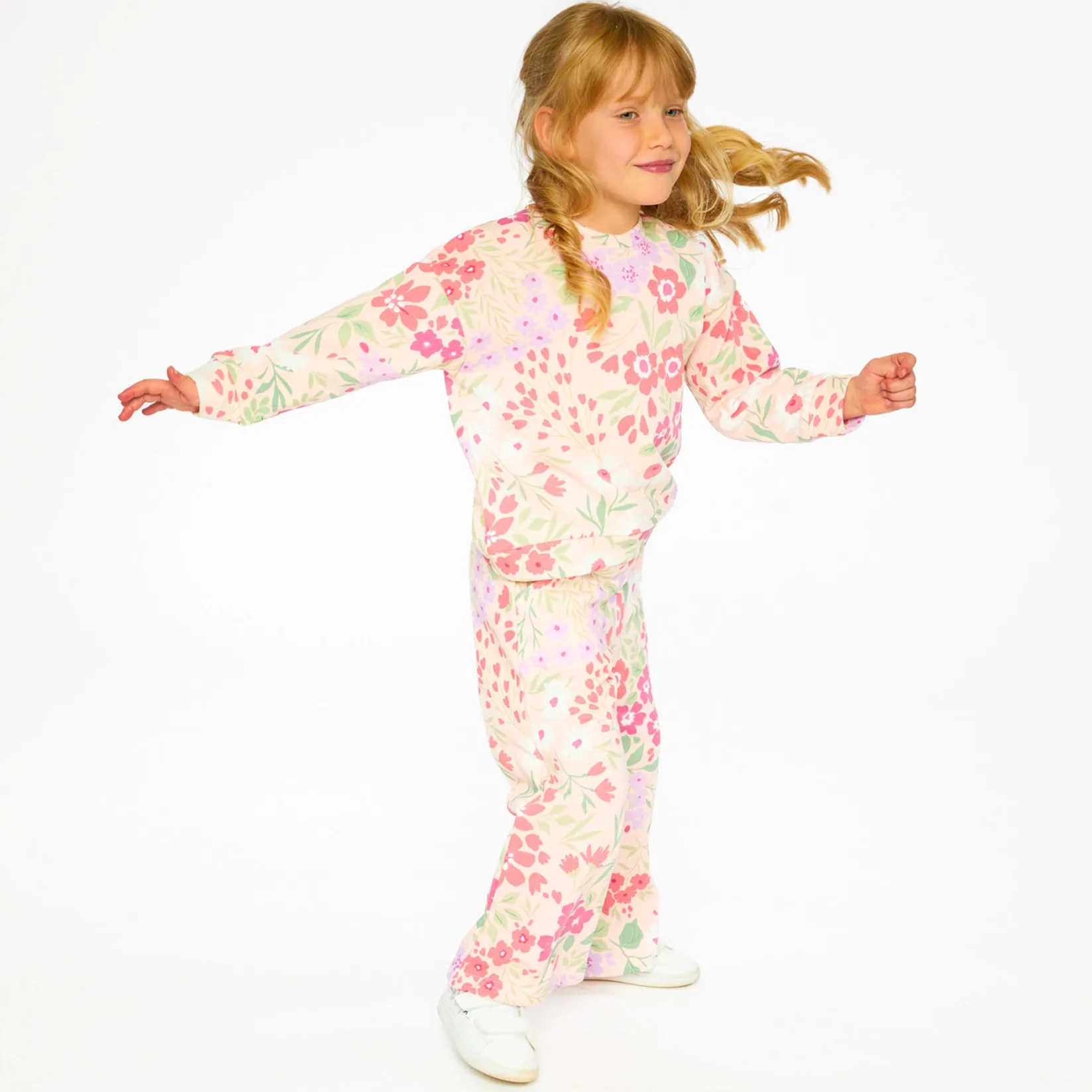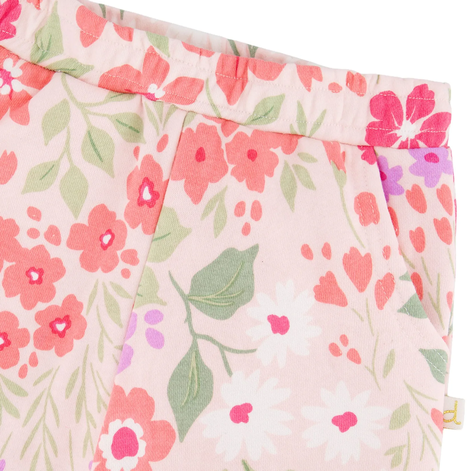 Our French terry pants pink with printed flowers are both comfy and playful. This straight-leg design features an elastic waistband, practical slant pockets, and a soft stretch feel for all-day ease. Covered in a lively pink floral print, these pants are a cheerful option for girls and baby girls alike.