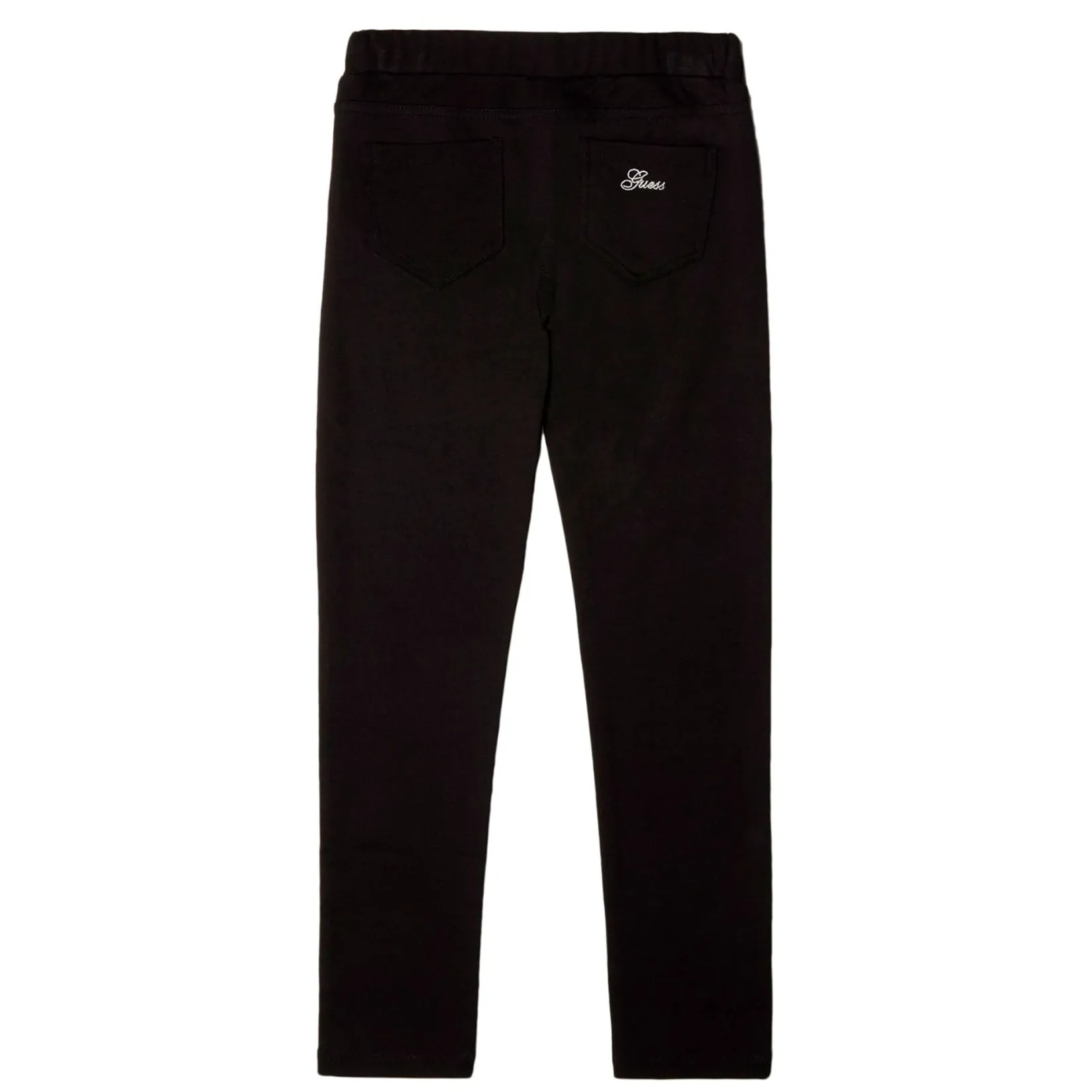 Features: Comfort of a legging in the look of a jean. Elastic waistband, back patch pockets with silver tone embroidered logo