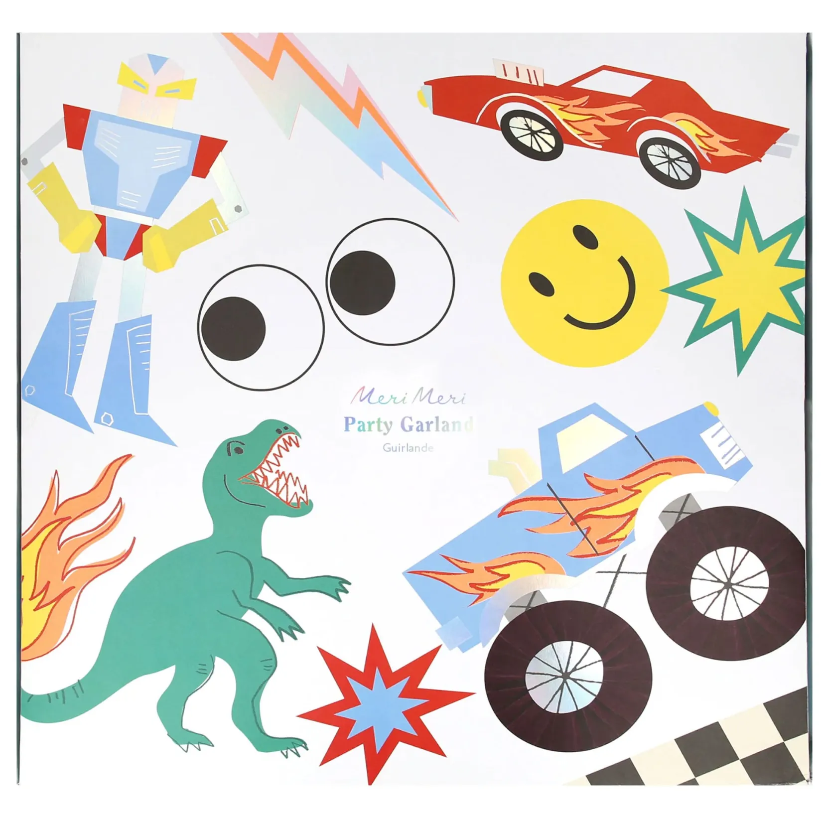 - The second string features a retro robot with dangling honeycomb legs and arms, a smiley face with honeycomb details, a T-rex, giant googly eyes, a monster truck with honeycomb wheel details, a robot, lightning bolts and checked flags