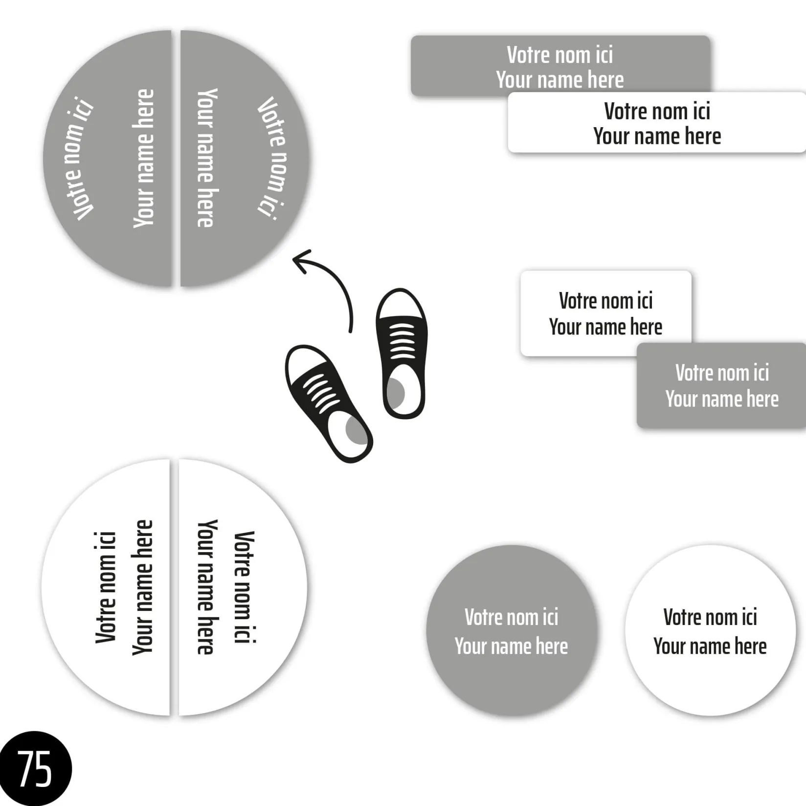 The Mini Edition is ideal for effectively identifying everyday items such as containers, clothing, shoes, and school supplies. This format includes 75 self-adhesive labels in various sizes, including 4 pairs designed specifically for shoes to help children identify the correct foot. Resistant to water, cold, heat, and steam, they are dishwasher, washing machine, dryer, microwave, refrigerator, and freezer safe. No labels require ironing: simply apply them to a clean, dry surface and wait 24 hours before exposing them to moisture or heat. The name and/or phone number is printed on two lines of 16 characters.