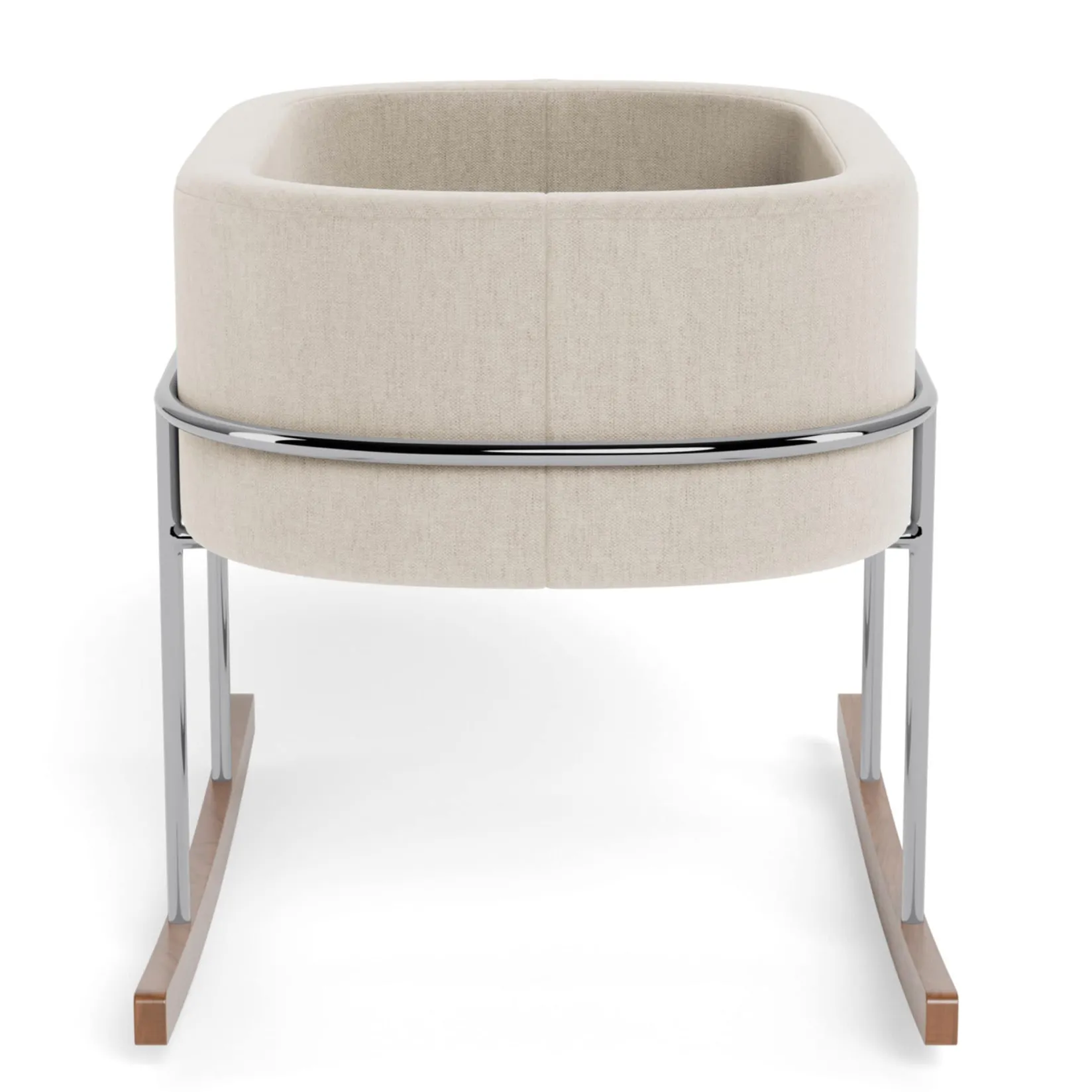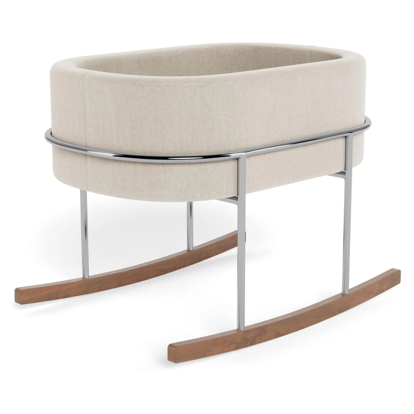 Our Rockwell bassinet is synonymous with ultimate modern luxury; it is the perfect combination of beautiful materials and a soothing rock for your little one. Its streamlined chrome stand with solid walnut rocking feet is beautifully contrasted to the soft upholstered basket that can be removed and transported to different rooms in your home (or the Grandparents’ home!). When you are finished with the bassinet, the basket alone makes an excellent spot to store all your baby’s new stuffies!