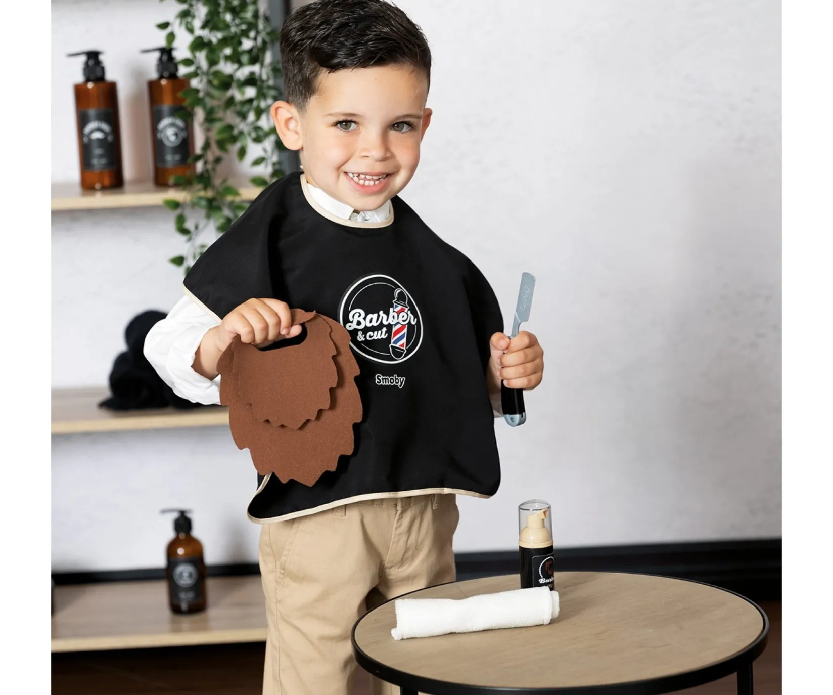 Composé de 5 accessoires réalistes, barbe, cape en tissus, coupe chou, flacon de mousse à raser factice et serviette, ce set permettra à l’enfant de tailler la barbe comme pour de vrai ou presque !