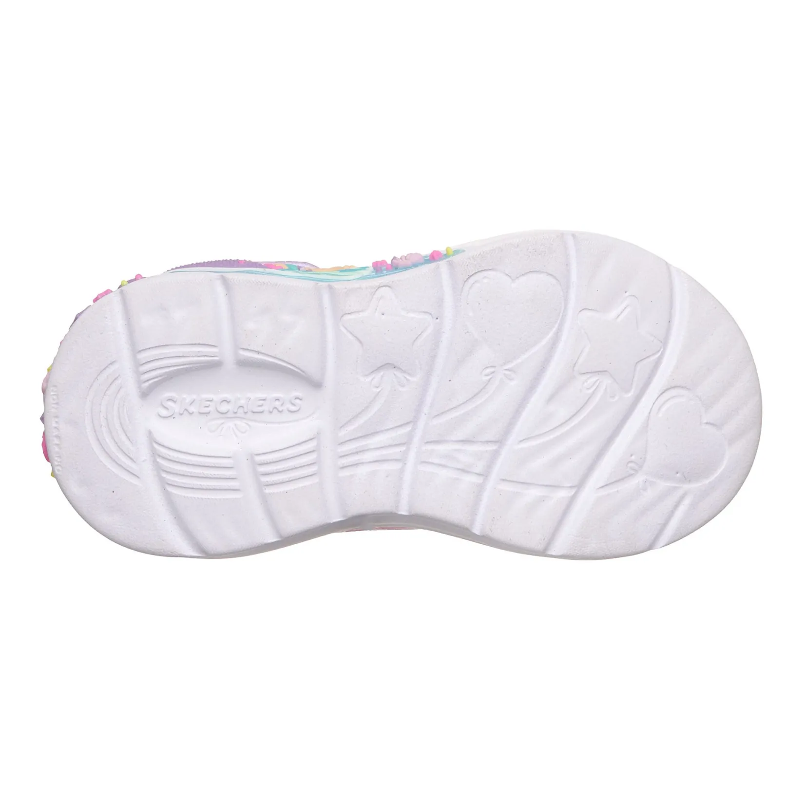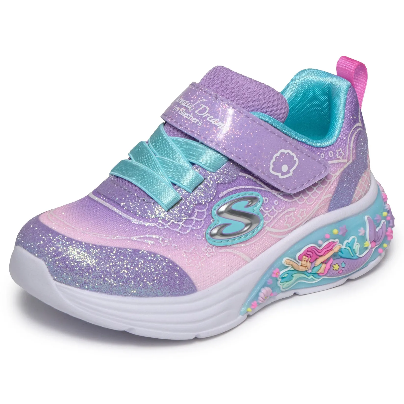 Playful lights and colorful fun combine in Skechers My Dreamers – Lil Mermaid. This light-up sky-themed style features an ombre glitter mesh and synthetic upper with stretch laces, adjustable instep strap and a well-cushioned light-up midsole.