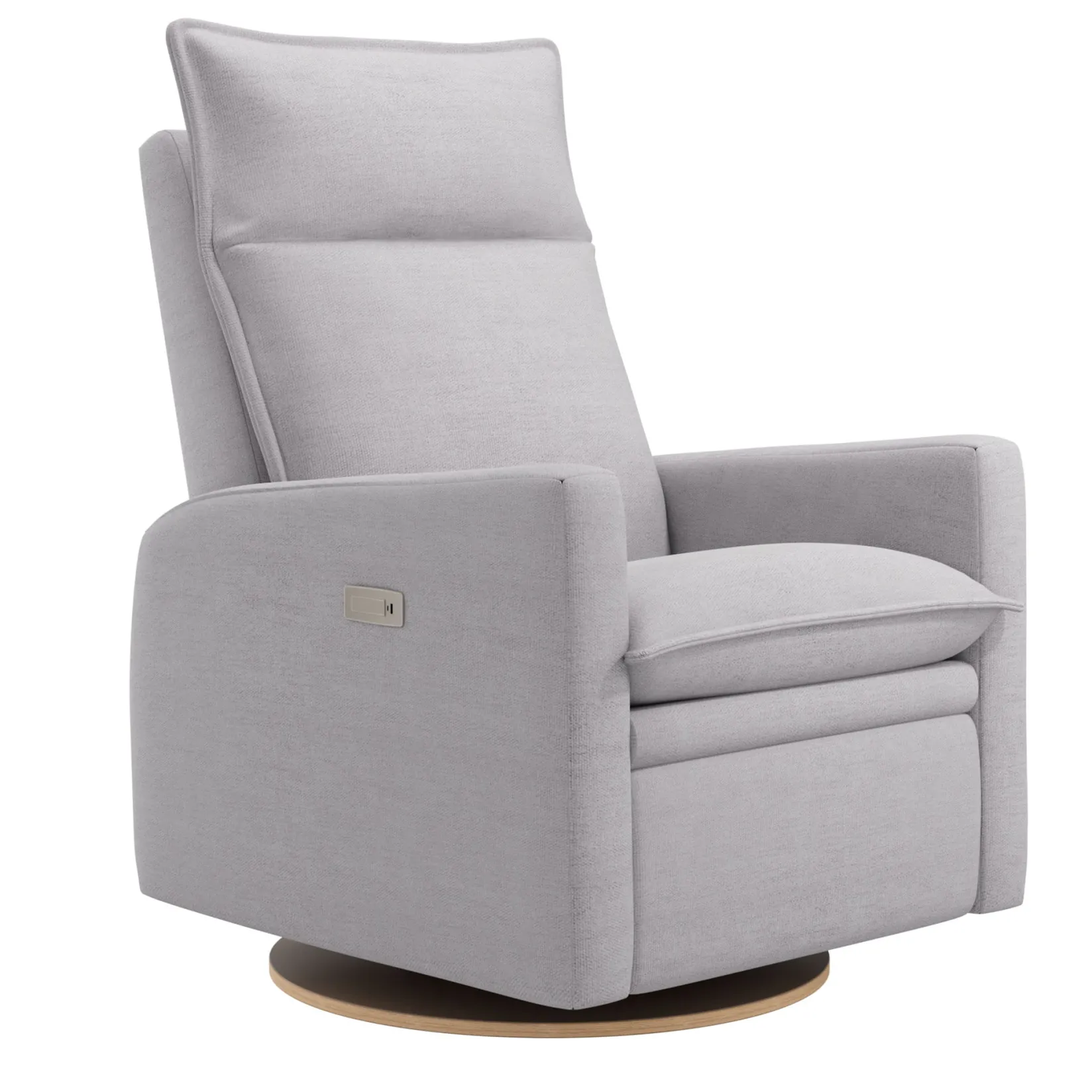 The new Arya power reclining chair brings an elegant, relaxed, and comfortable style to baby’s rooms. Its plush cushions allow you to sink into the chair and find the ideal position for ultimate relaxation.The power version offers smooth motorized reclining, with a control panel built into the armrest featuring buttons to control the recline, as well as USB and USB-C ports to keep electronic devices within reach.The recliner swivels with a smooth rocking motion, so you won’t disturb your little one’s sleep while settling in comfortably.