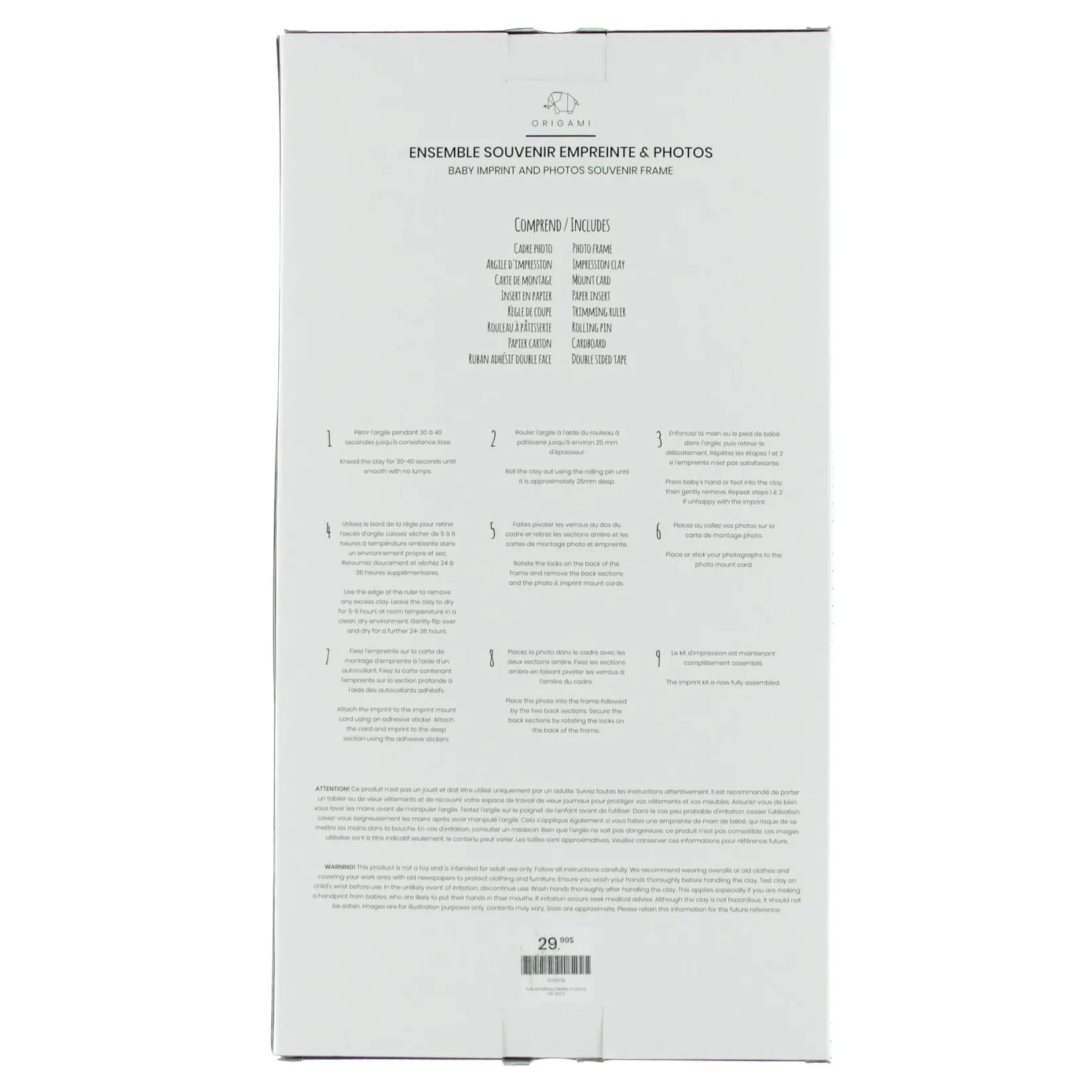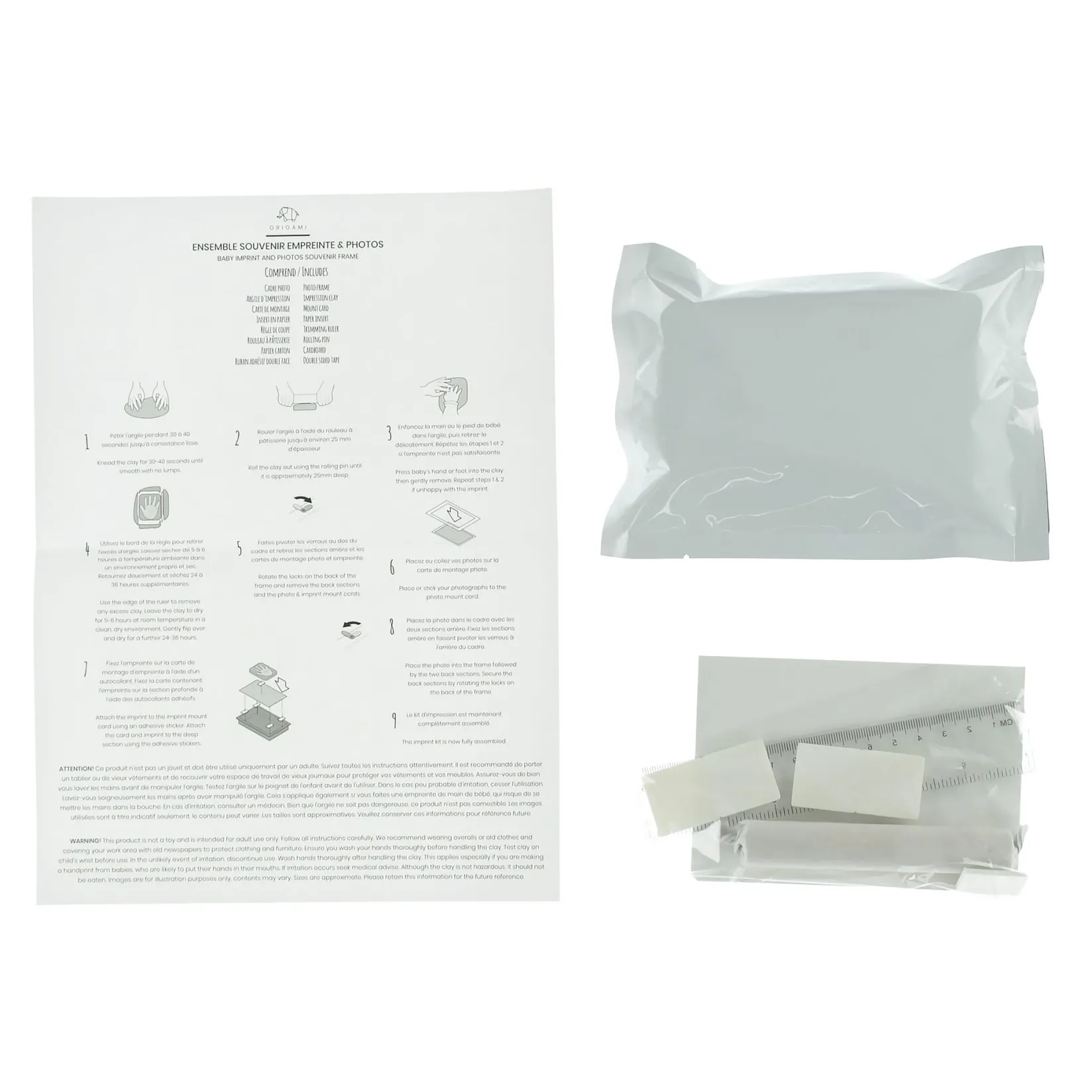 -Includes a photo frame, an impression clay, a mount card, a paper insert, a trimming ruler, a rolling pin, a cardboard and a double sided tape
