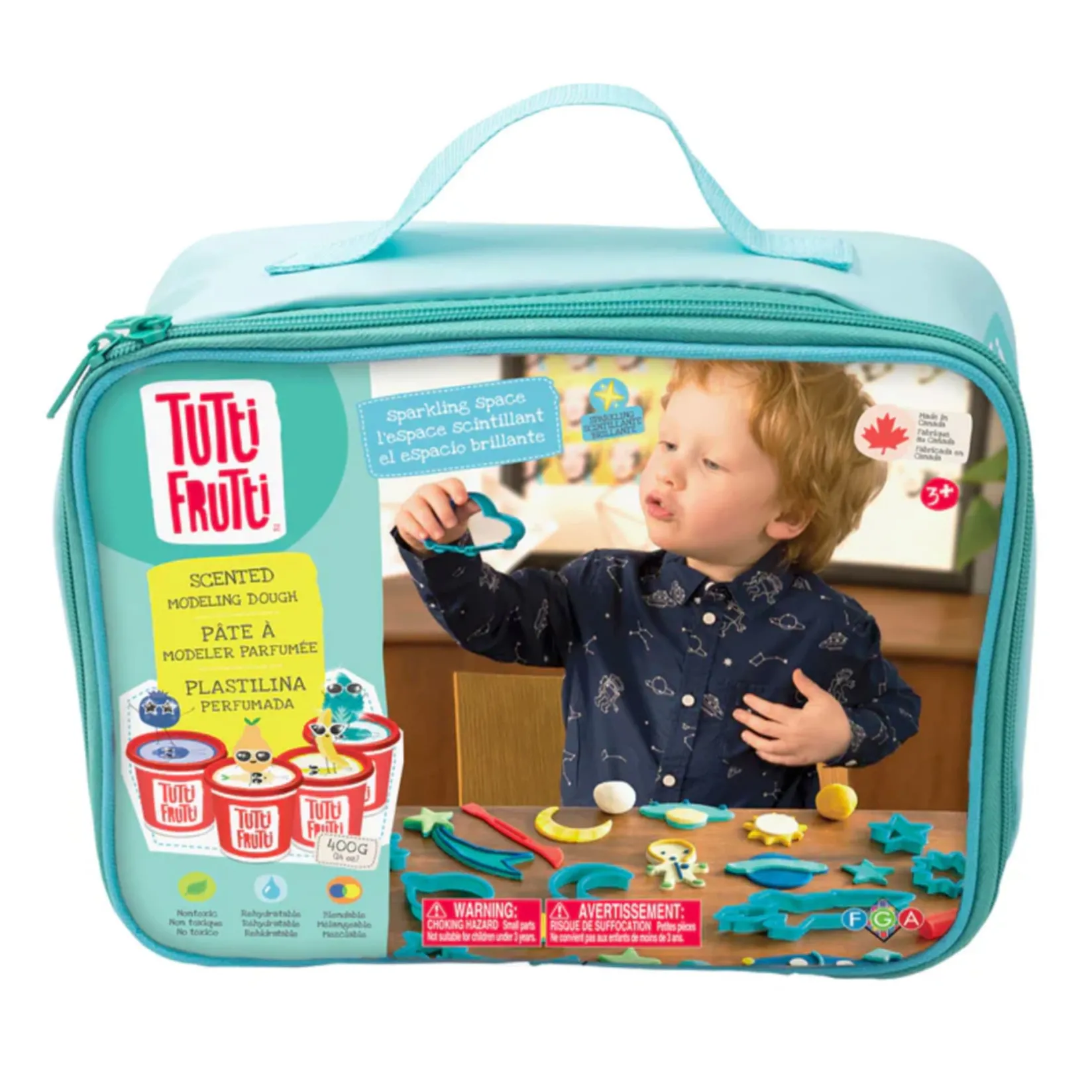Fly me to the moon and travel through the stars. Multiple tubs of sparkling modeling dough have children molding and cutting out space-themed pieces with included cutters. With the benefit of sparkling dough, a sprinkle of magic is added to each and every creation. In handy 10.75” x 8.25” x 3.5” fabric carry bag.