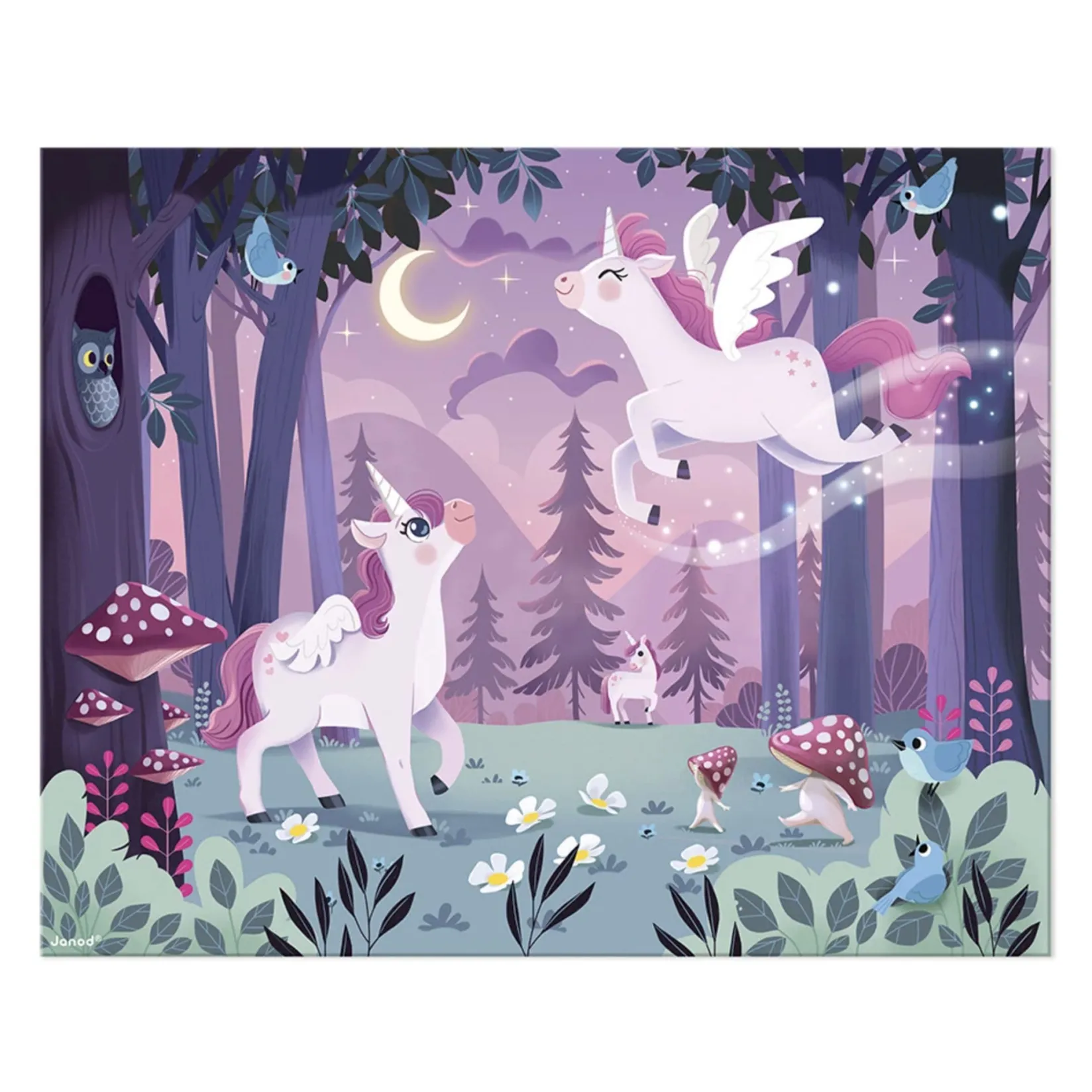 Ah, unicorns! Immerse yourself in their fairytale world with this 54-piece illustrated puzzle, suitable for children aged 5 and over. This enchanting 50×40 cm puzzle immerses the whole family in the heart of a magical forest, populated by fantastic little creatures, where unicorns have a field day!