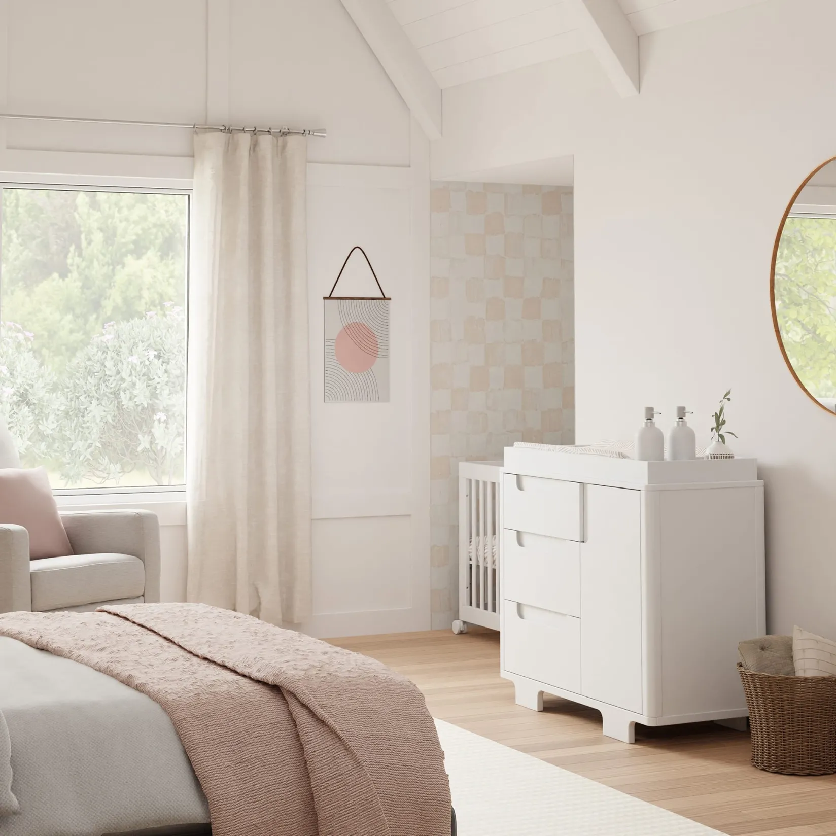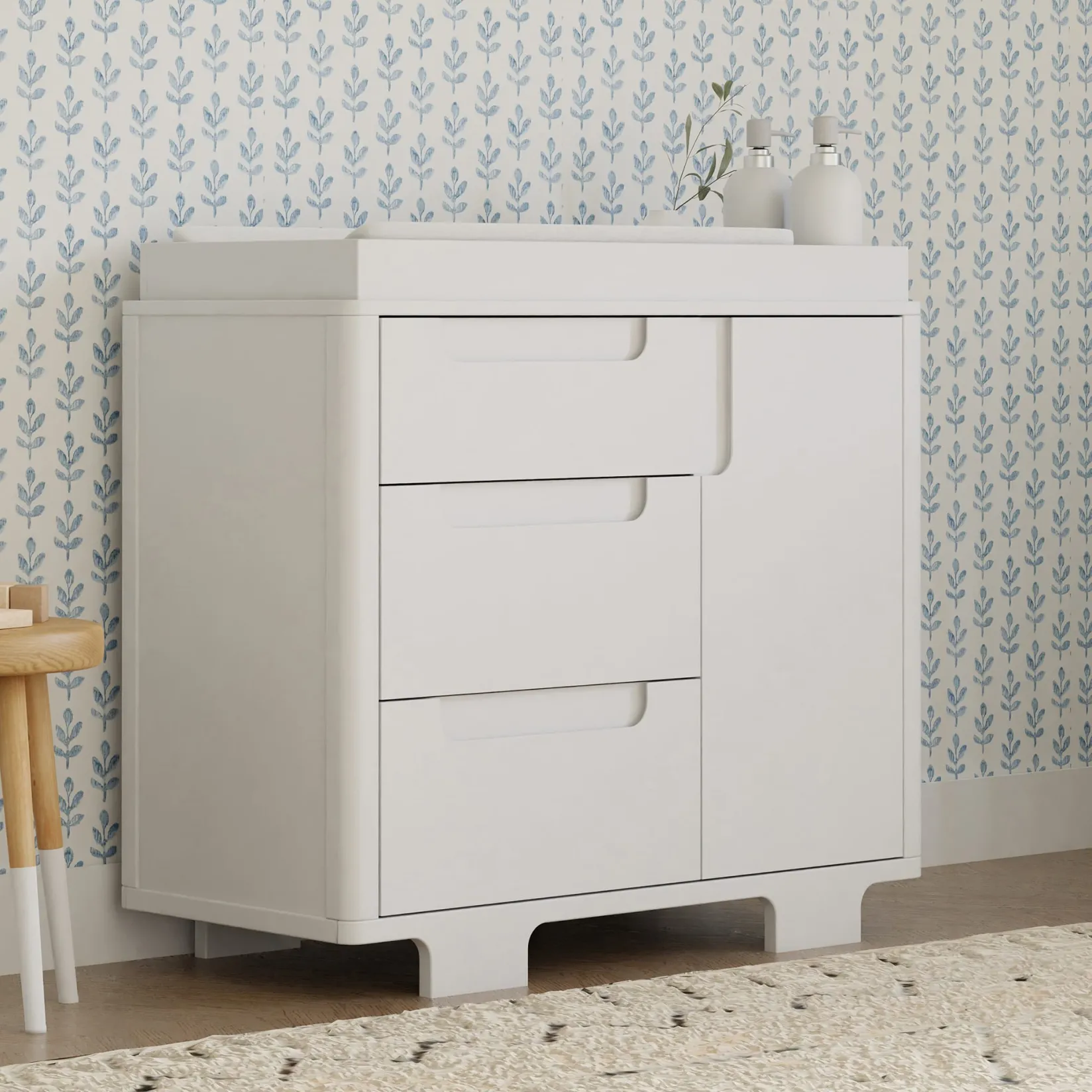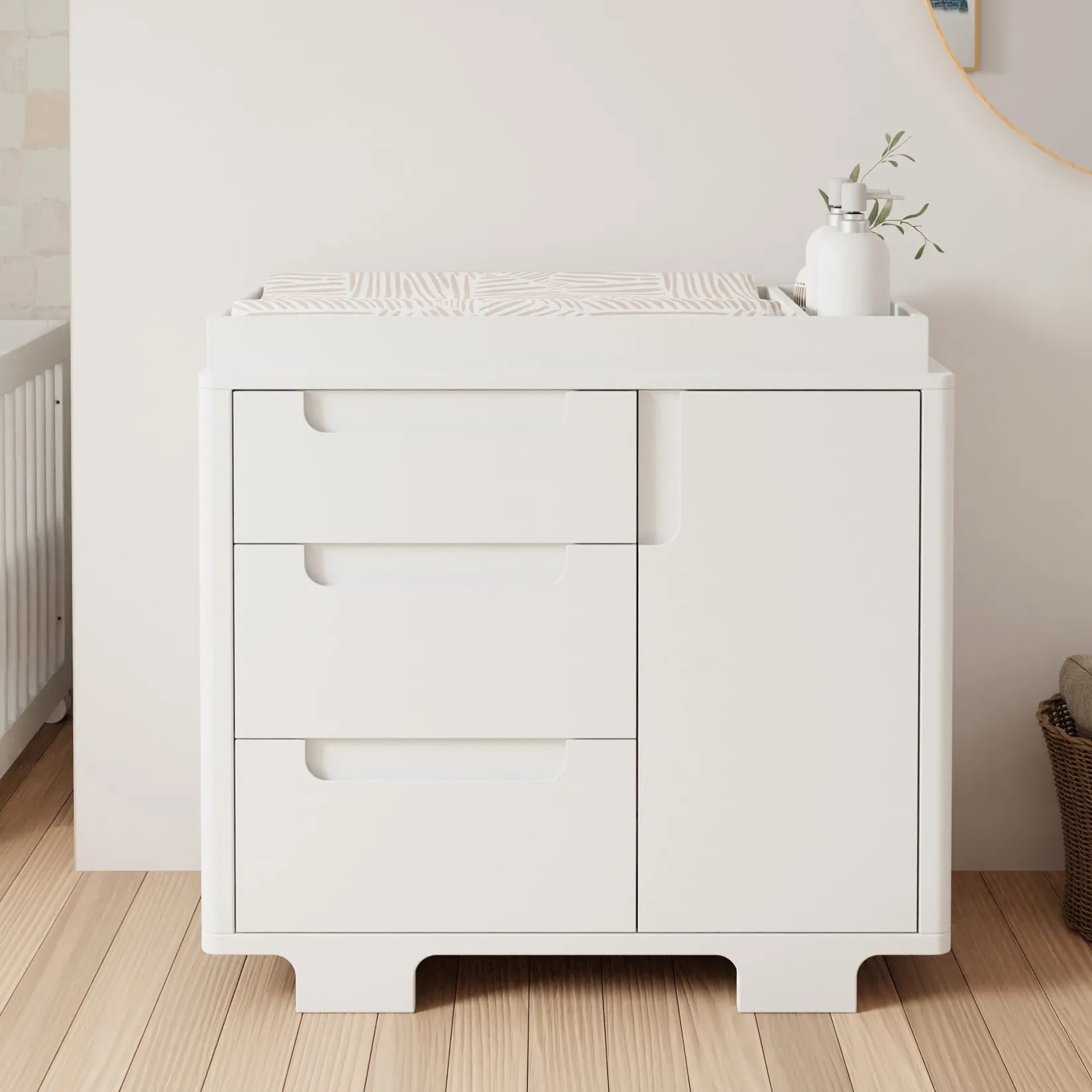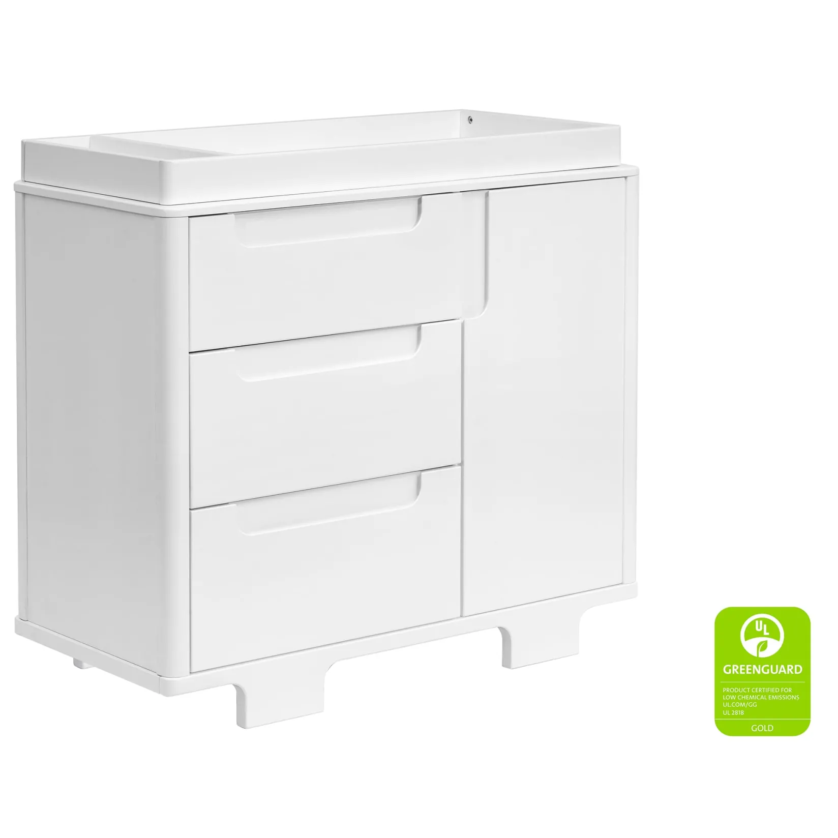 Designed to complement the Yuzu 8-in-1 All-Stages Crib, the Yuzu 3-Drawer Changer Dresser marries form and function with playful arched feet, gently curved corners, included changing tray, and plenty of storage with 3 drawers and 1 spacious cabinet. Whether you’re going for a classic, modern, or eclectic look, this versatile dresser is a perfect statement piece in the nursery.