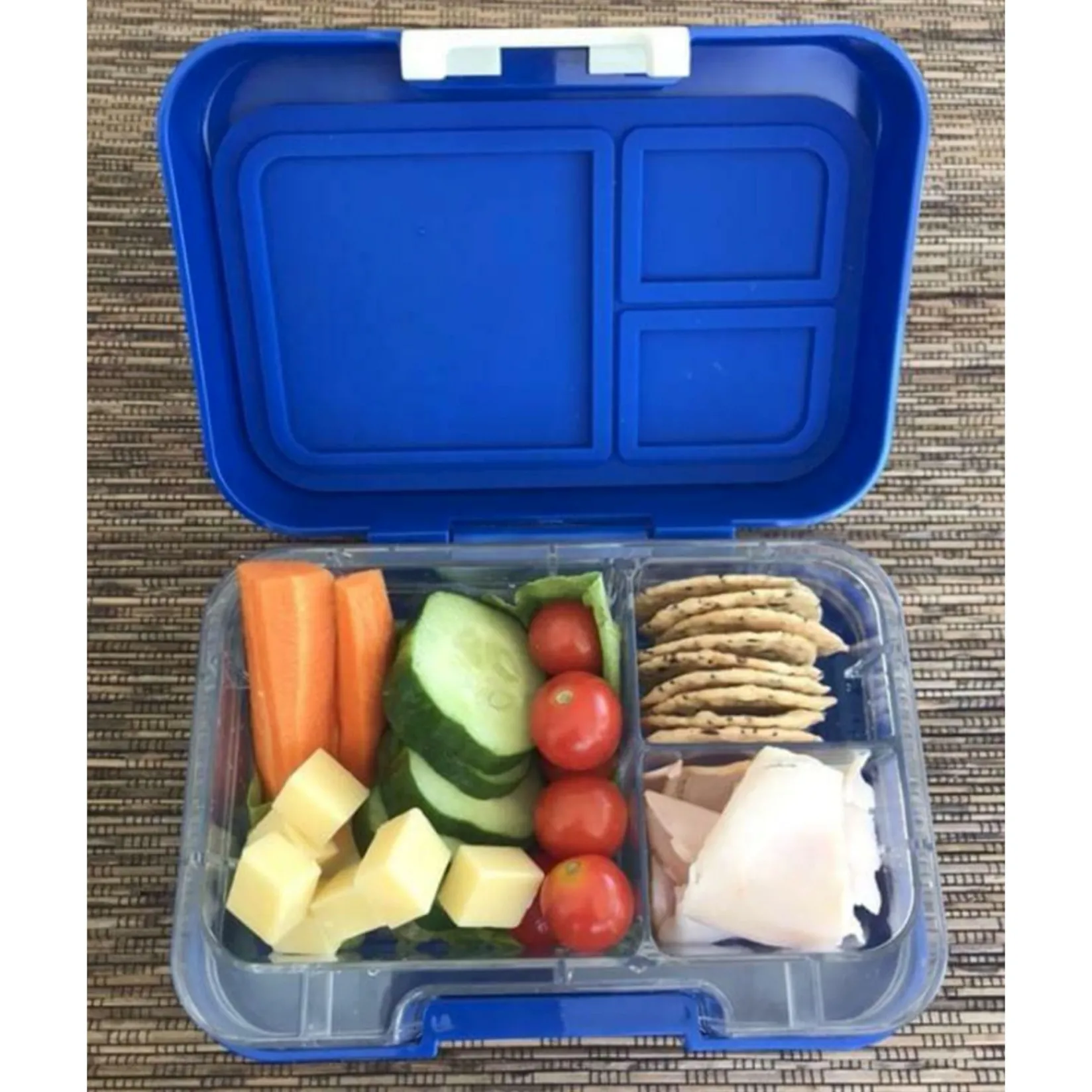 Munchi Snack Munchbox includes one outer box (3 compartment design) and two interchangeable trays (2 and 3 compartments).