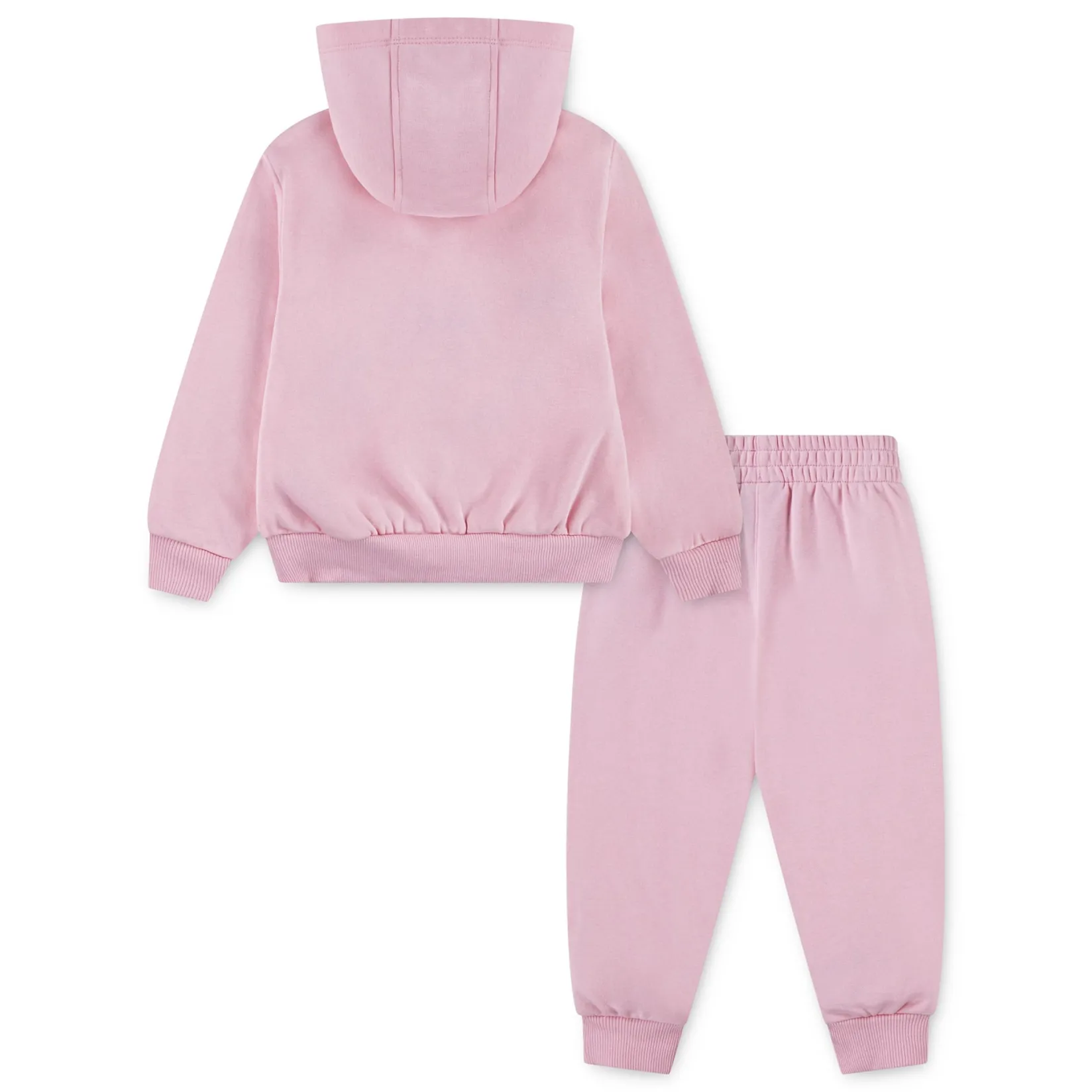 Looking for an easy way to outfit your little one in all-day comfort? This two-piece Nike set, made of soft fleece fabric, has you both covered. The roomy hoodie has a full-zip closure that makes layering over a tee or tank easy and the matching tapered pants have a stretchy waistband for a comfy, secure fit. Pair with any Nike top for a complete look that complements their favorite kicks.Â
