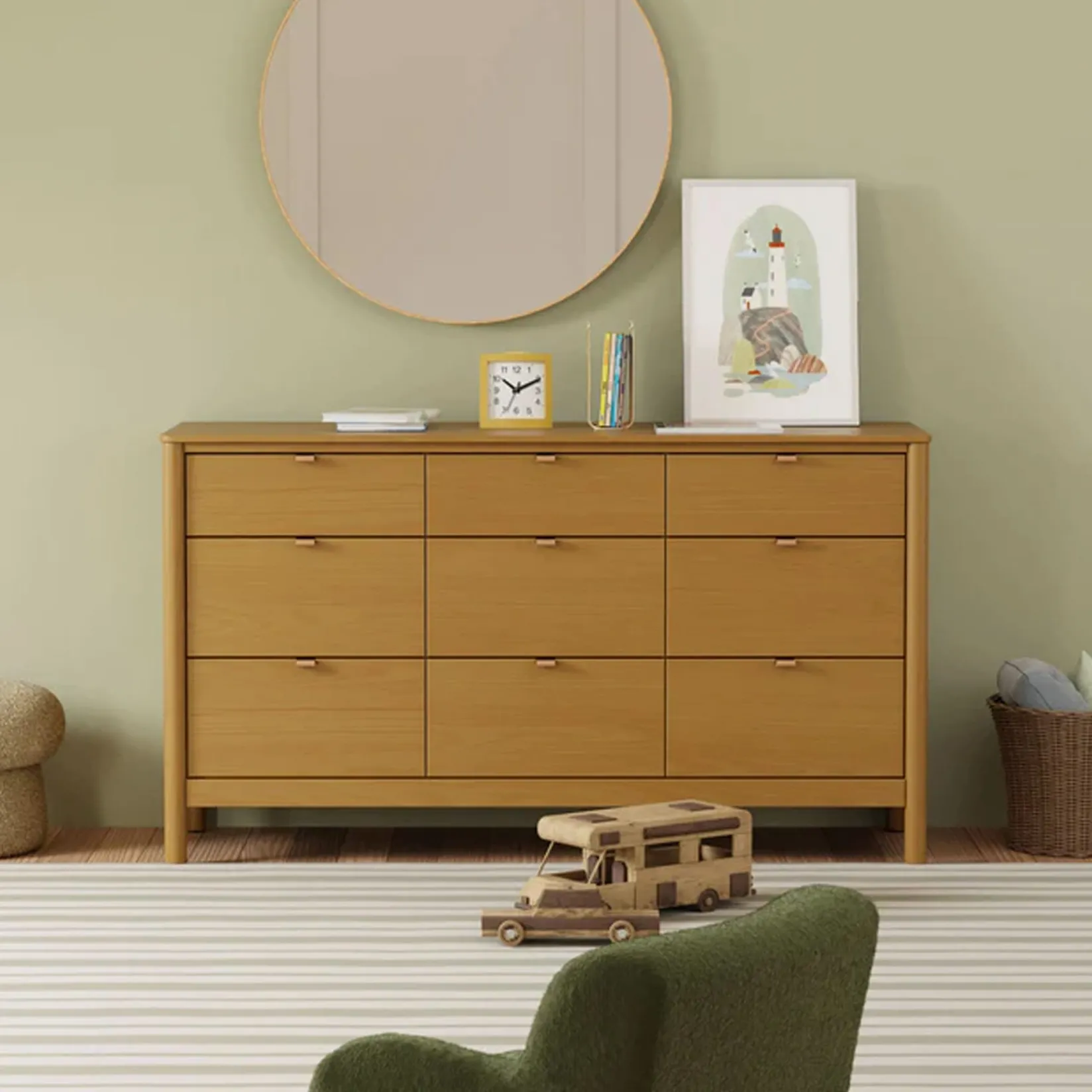 Designed to grow alongside your kiddo and keep up with their constantly changing needs, the Bondi 9-Drawer Assembled Dresser combines clean lines, rounded posts, generous storage, and soft vegan leather pulls for a modern look that fits perfectly in any big-kid space. With nine roomy drawers and a fully assembled design (yes, really!), it’s ready to store everything from tiny socks to big imaginations.