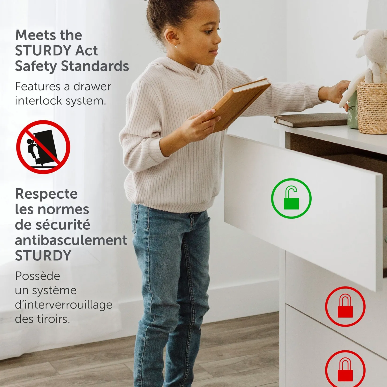 -SAFETY STANDARDS: The well-being of your family is important to us. That’s why our clothing storage units meet the tip-over safety standards required by the STURDY (Stop Tip-overs of Unstable, Risky Dressers on Youth) Act and features a drawer interlock system that allows only one row of drawers to be opened at a time.