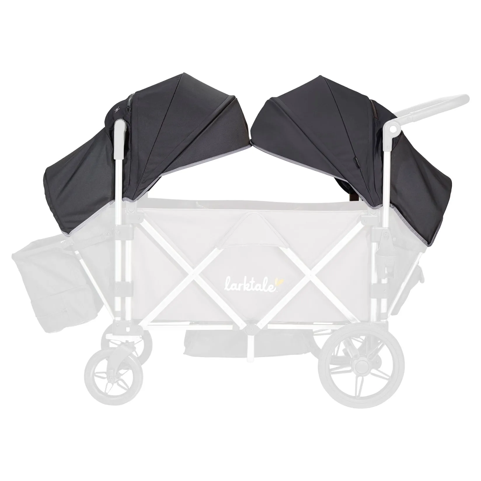 Your little Larktale riders can weather it all with the multi-purpose sun canopies for the Larktale caravan™ stroller/wagon (sold separately). This set of two sun canopies attach to protect each seat individually with a UPF50+ rating. Each sun canopy set features built-in protective rain and bug covers that extend over the entire caravan™ but cleverly stow away when not in use.